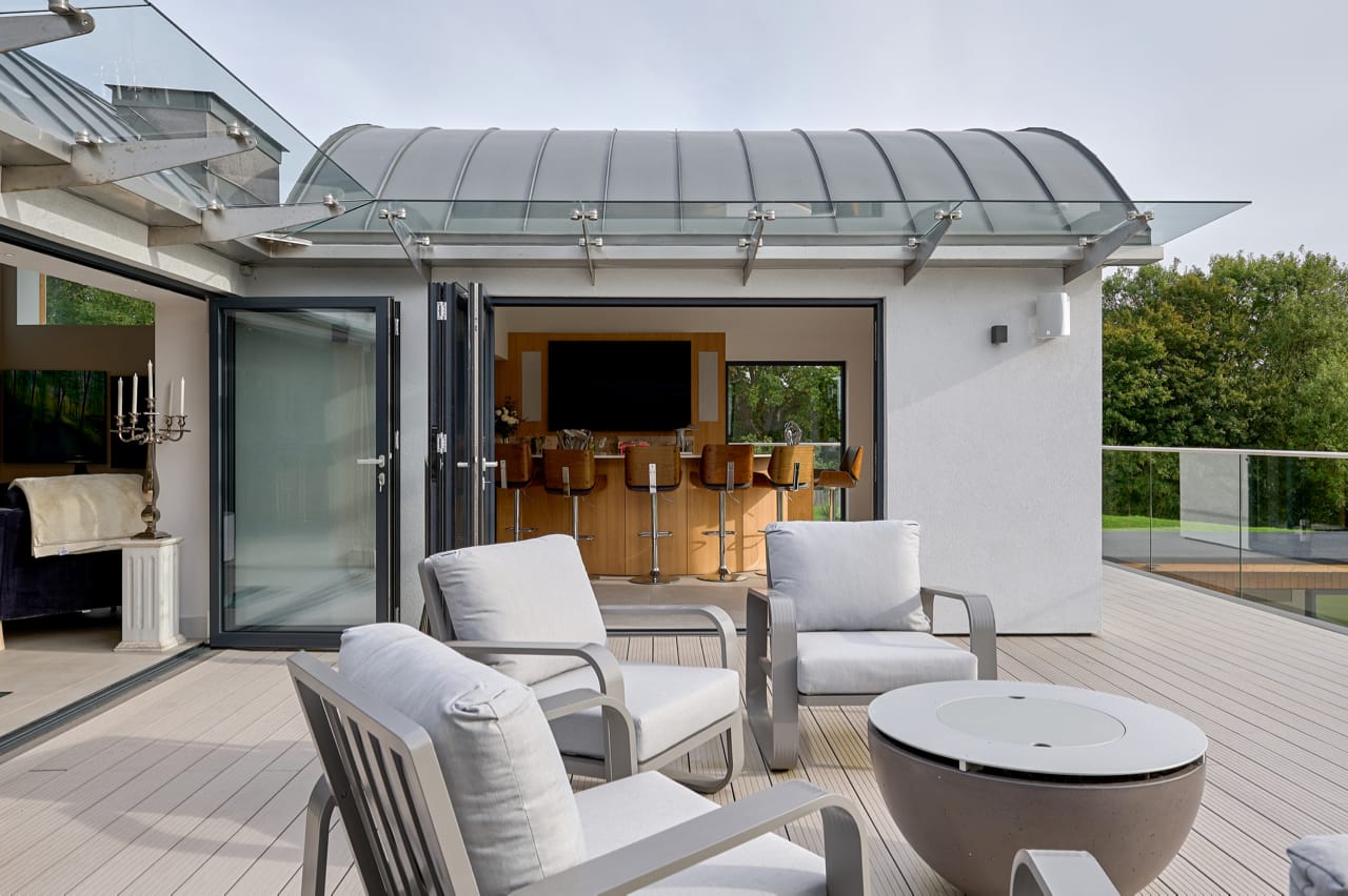 A stunning, incredibly light and spacious home. It’s set in 8 acres of idyllic grounds, with a lake and woodland. The top floor has an open kitchen and dining area, a study and a bar that overlooks a huge swimming pool.. It’s truly amazing! Located in Cranleigh, Surrey.