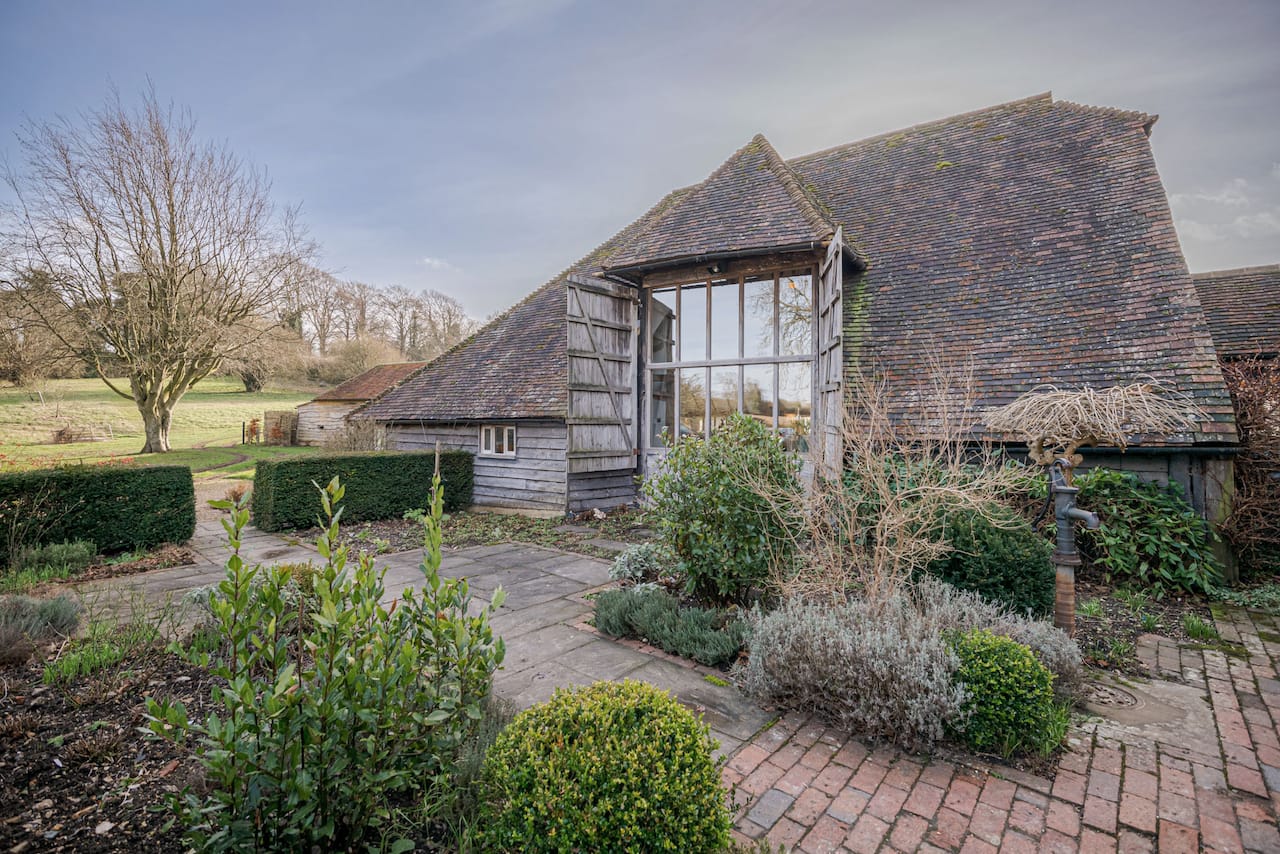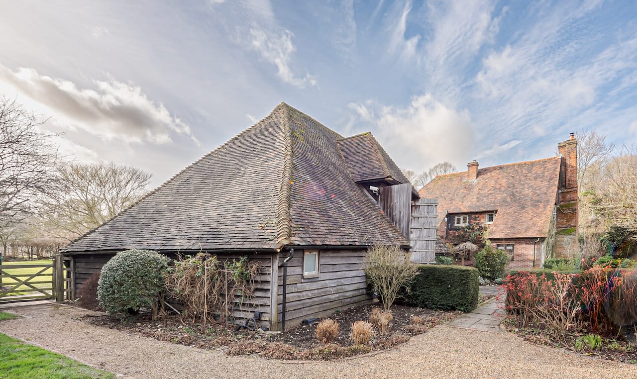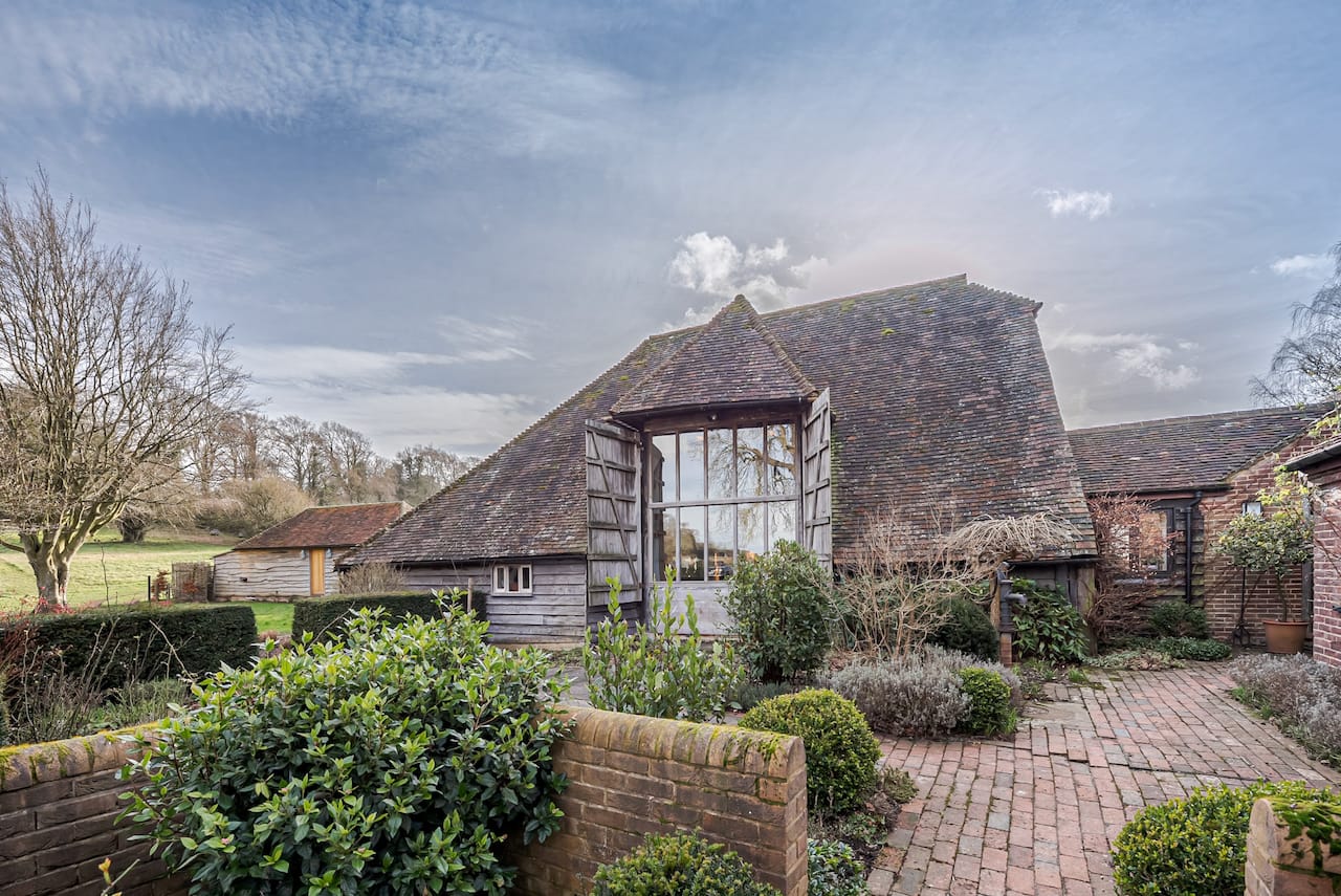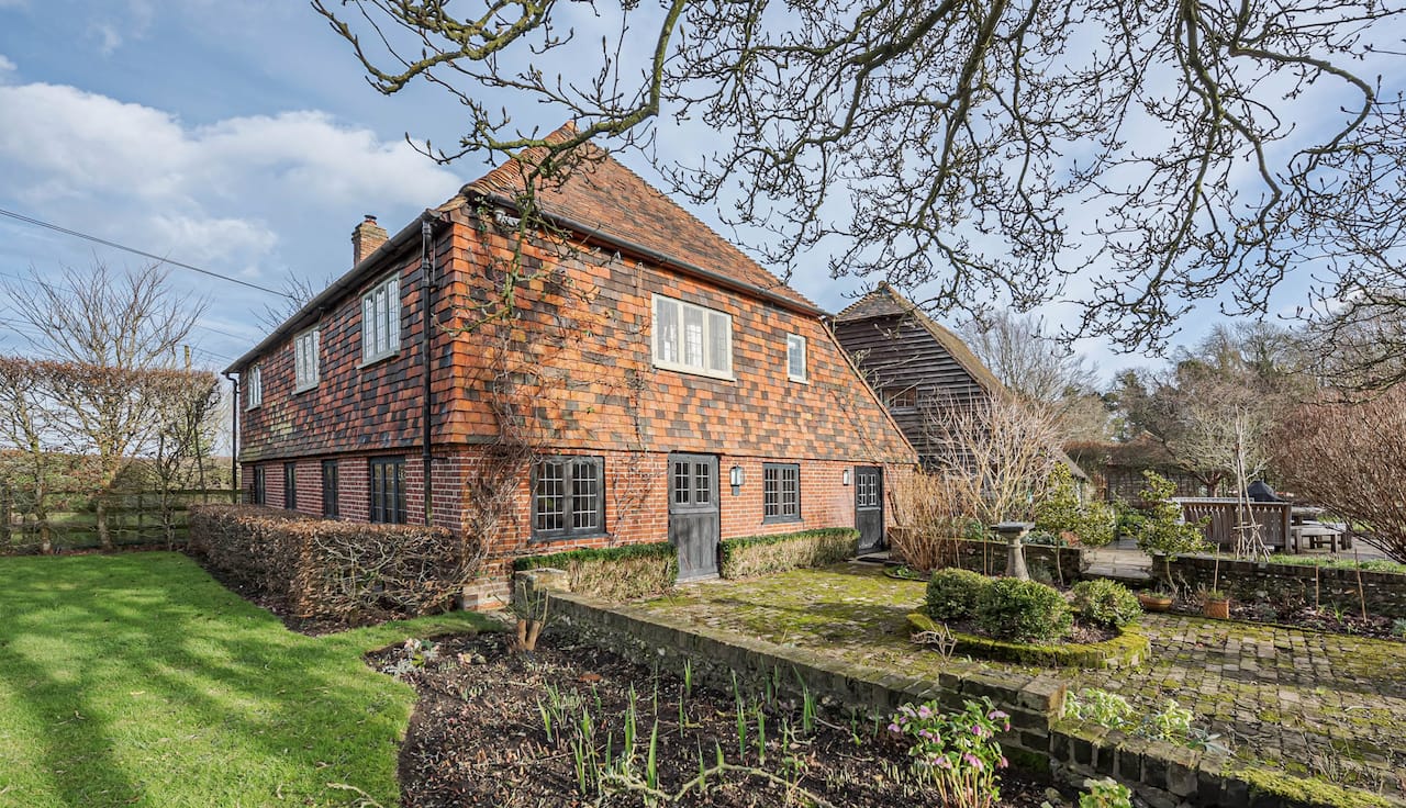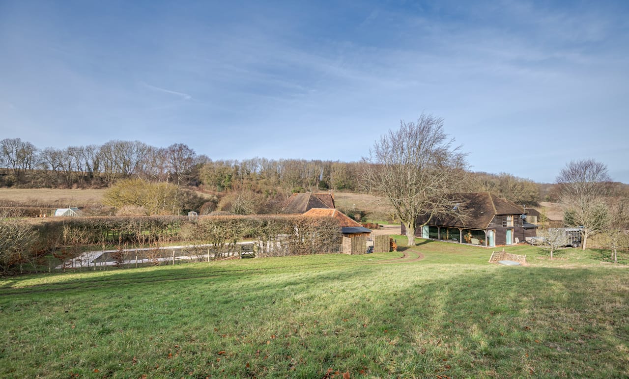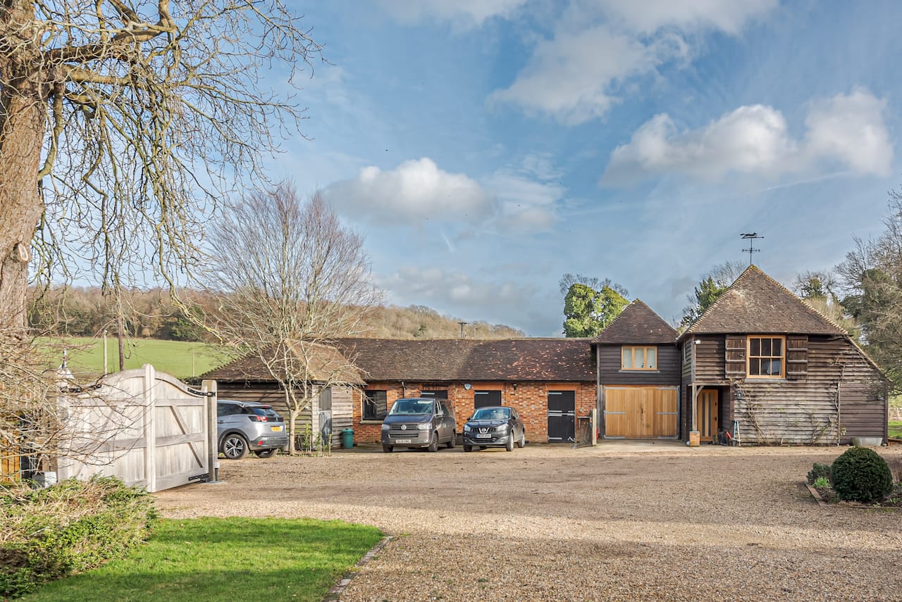 A late 16th Century Country House with fully furnished converted barn, swimming pool & pool house, stable yard, fields & paddocks . A traditional English cottage with valley views (North Downs), located in Kent, TN15.