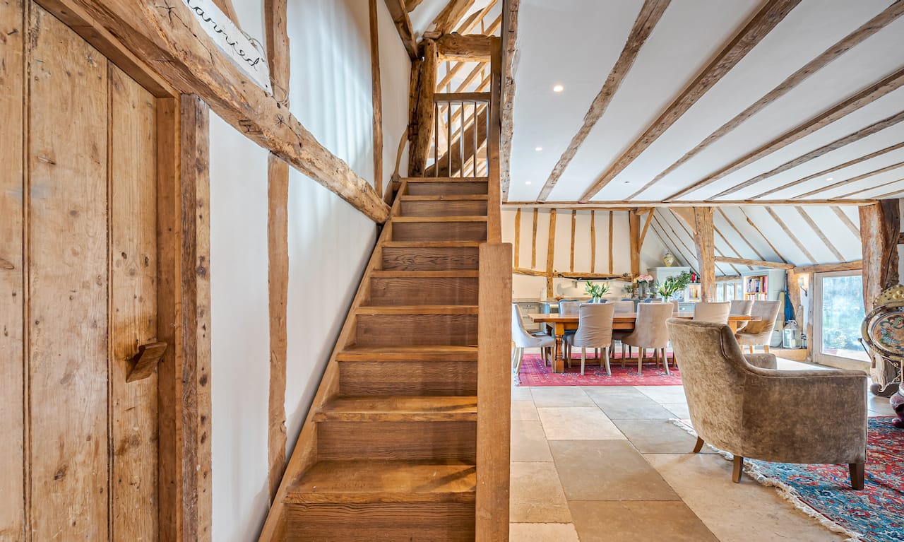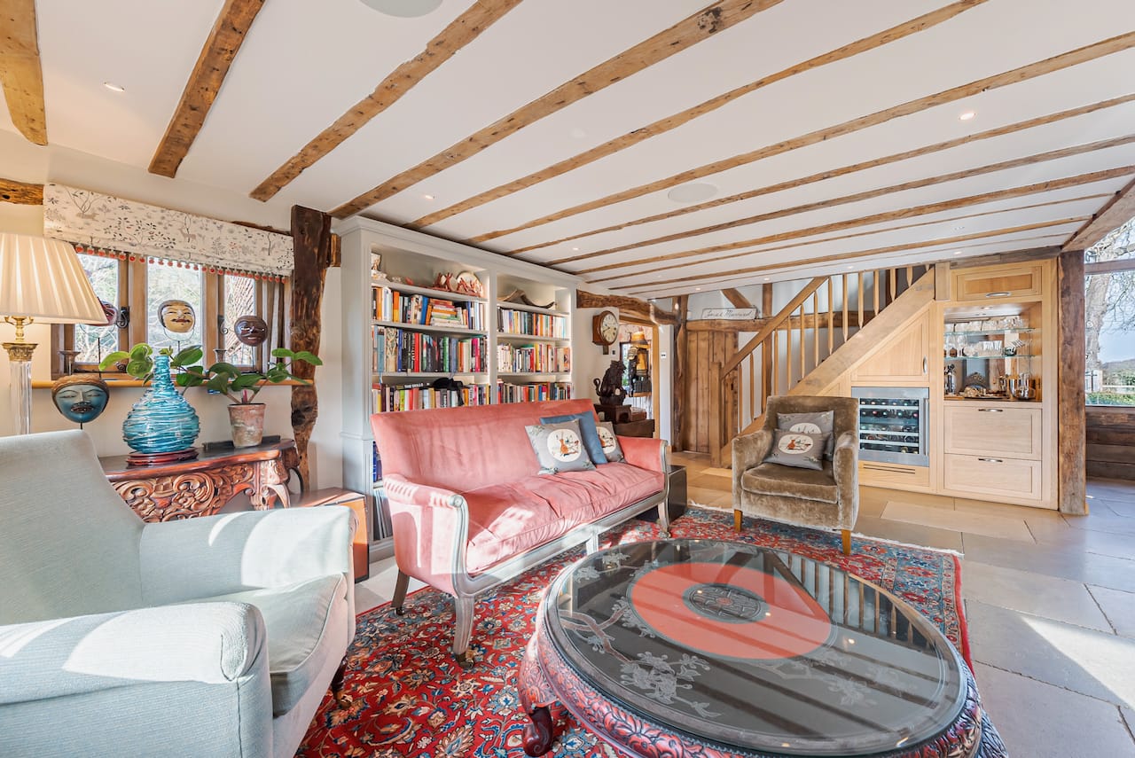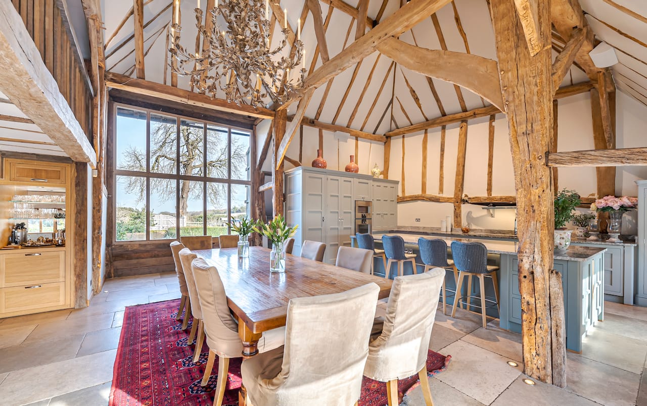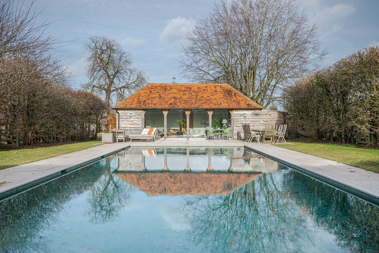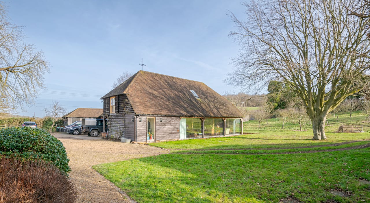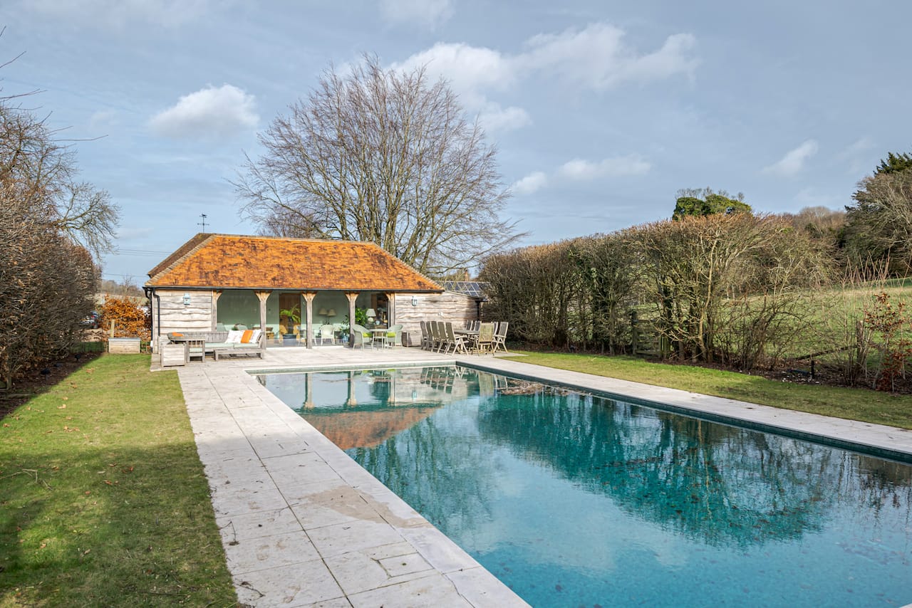 A late 16th Century Country House with fully furnished converted barn, swimming pool & pool house, stable yard, fields & paddocks . A traditional English cottage with valley views (North Downs), located in Kent, TN15.