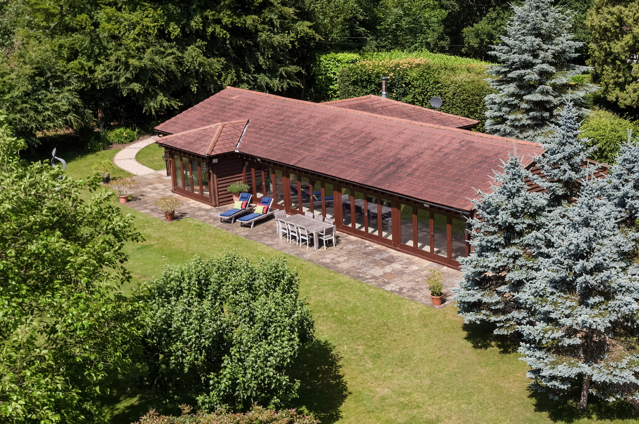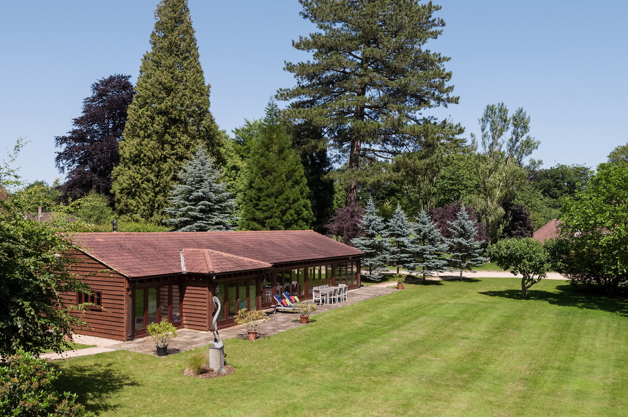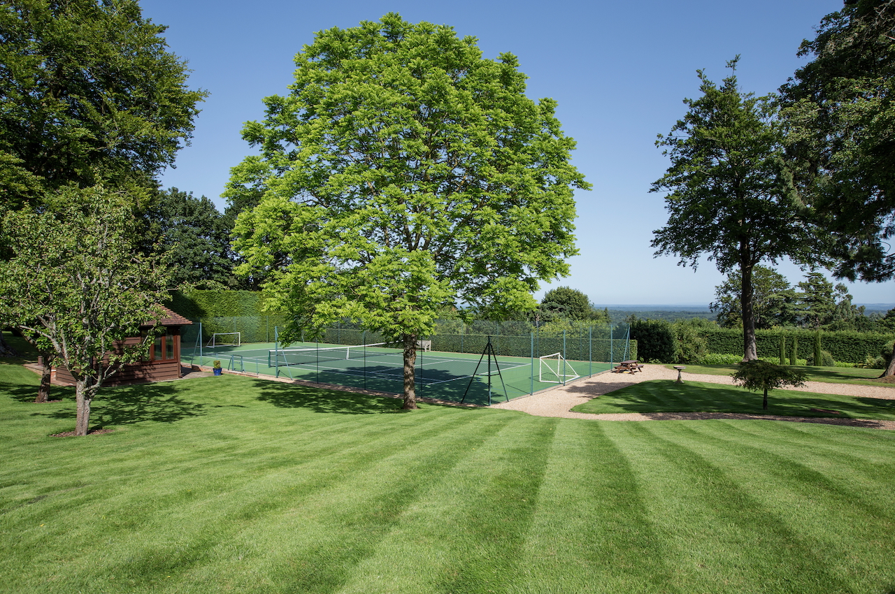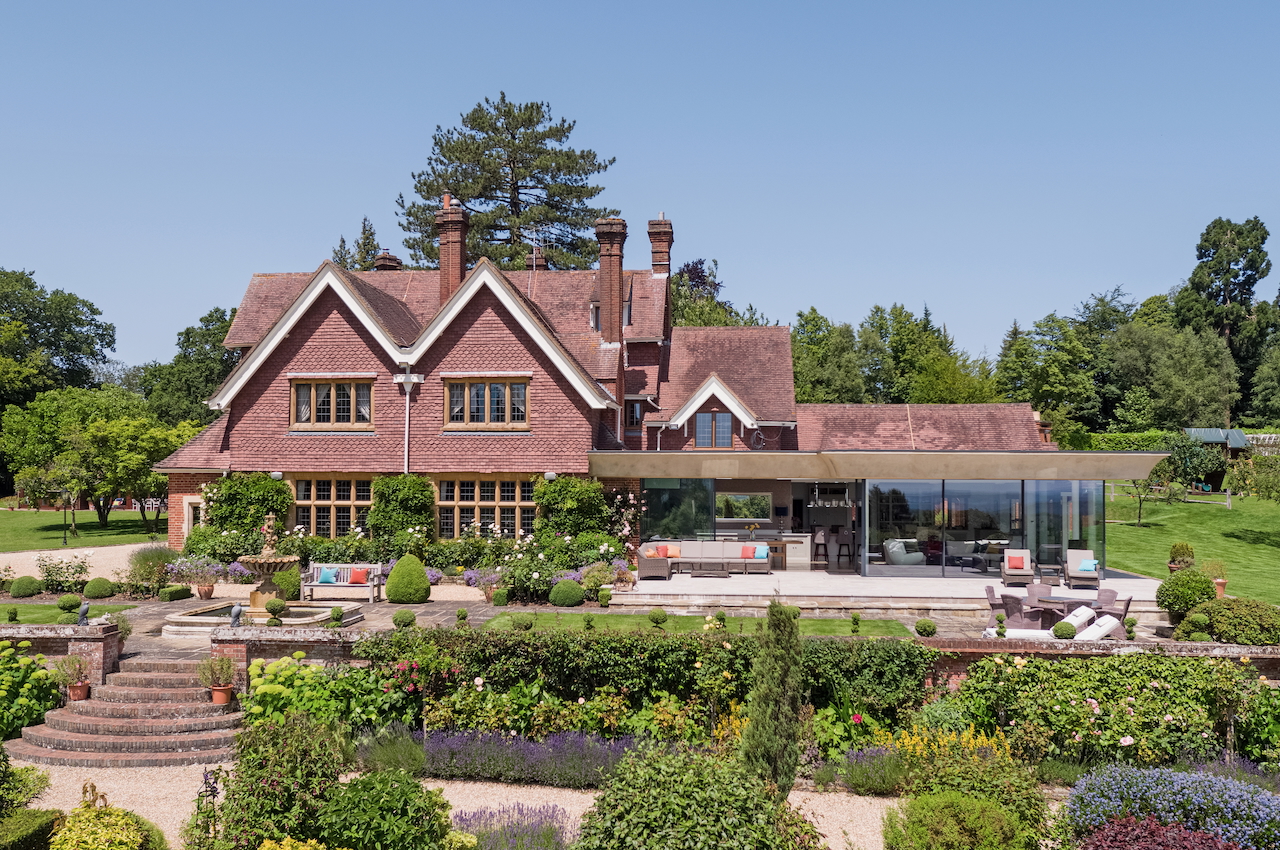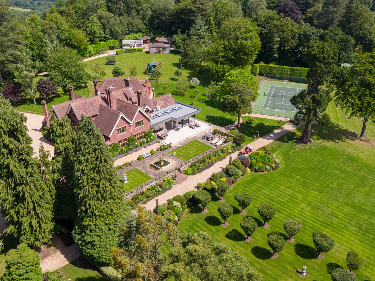 A stunning combination of traditional and an modern glass extension. Large open plan living that opens up to the 10 acre garden with lots of onsite parking, outbuildings and shoot + stay options. Comes with separate indoor pool, gym and tennis court. Located in Surrey.