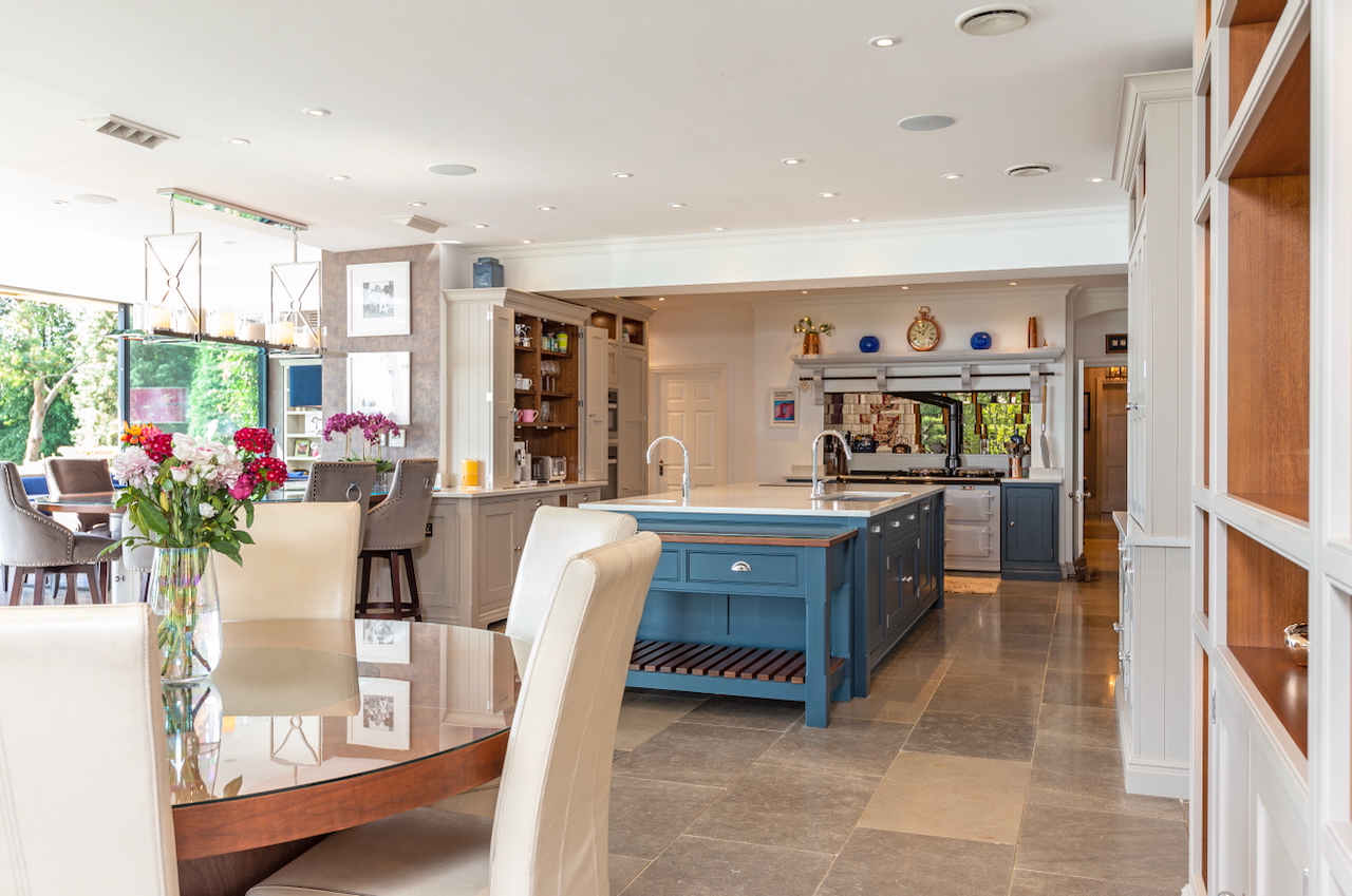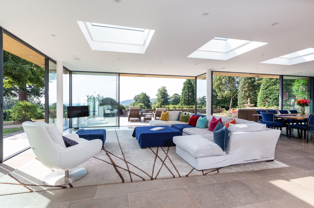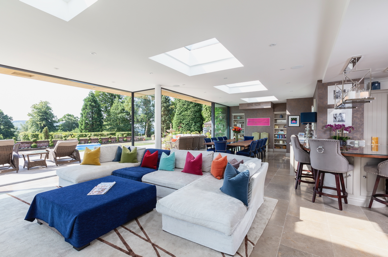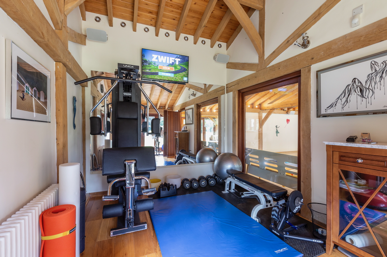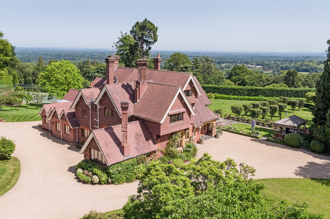 A stunning combination of traditional and an modern glass extension. Large open plan living that opens up to the 10 acre garden with lots of onsite parking, outbuildings and shoot + stay options. Comes with separate indoor pool, gym and tennis court. Located in Surrey.