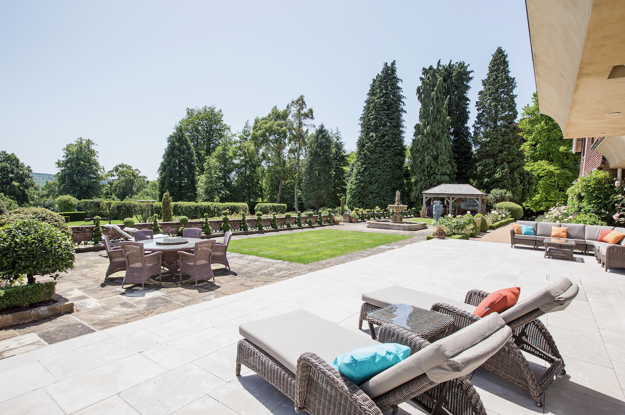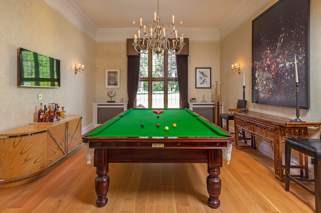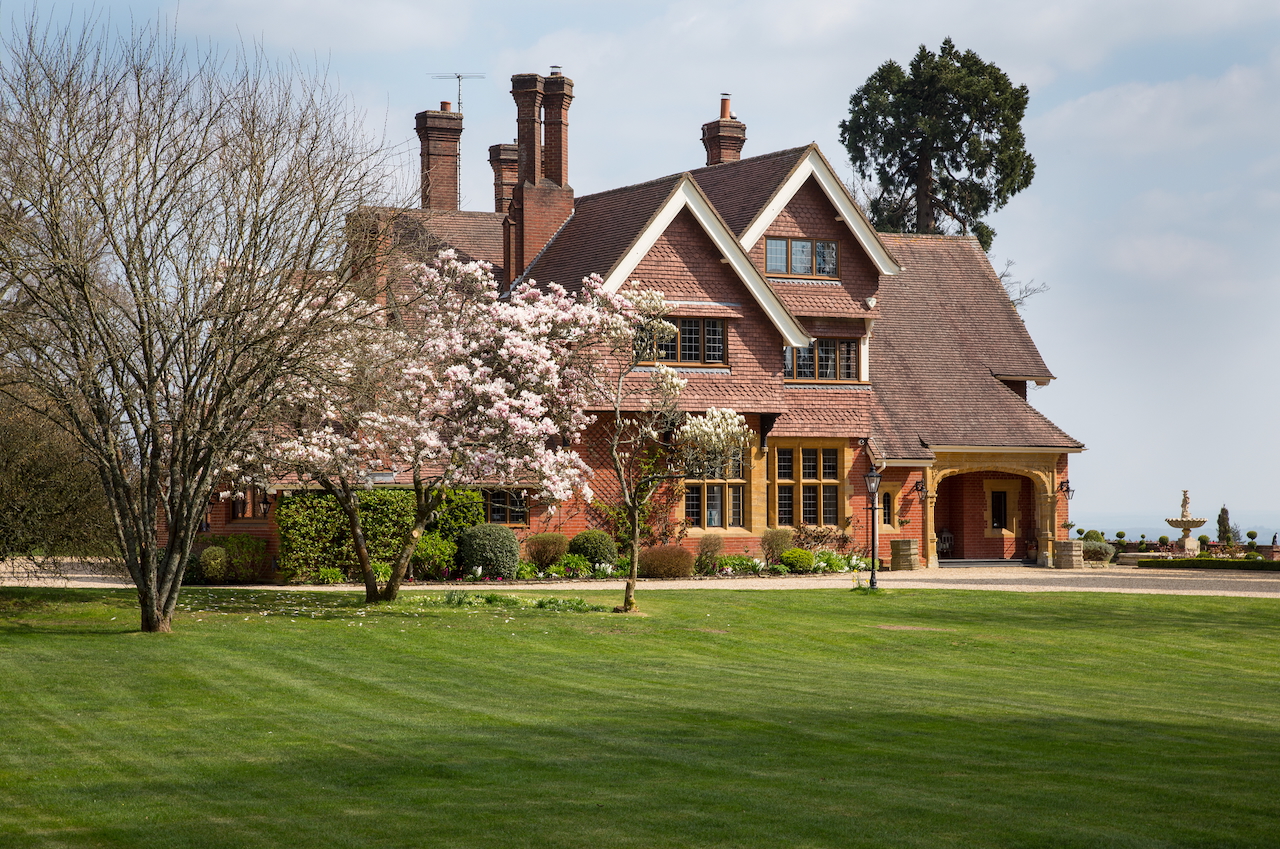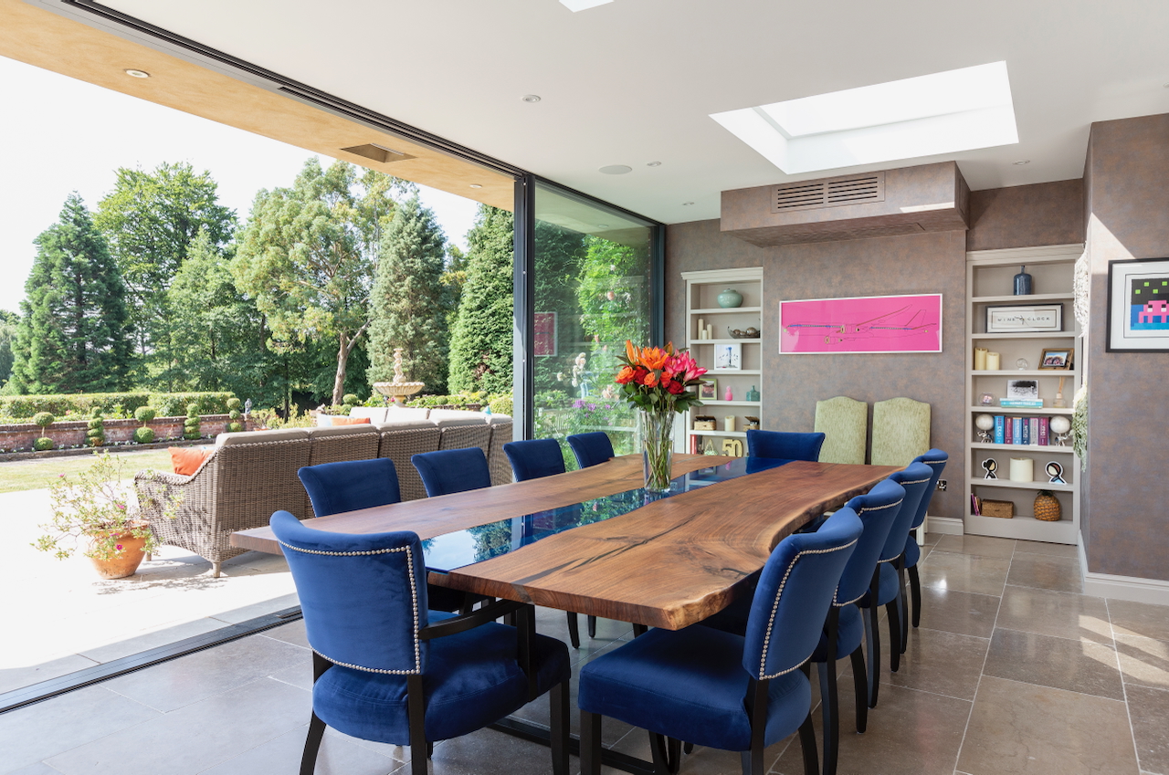 A stunning combination of traditional and an modern glass extension. Large open plan living that opens up to the 10 acre garden with lots of onsite parking, outbuildings and shoot + stay options. Comes with separate indoor pool, gym and tennis court. Located in Surrey.