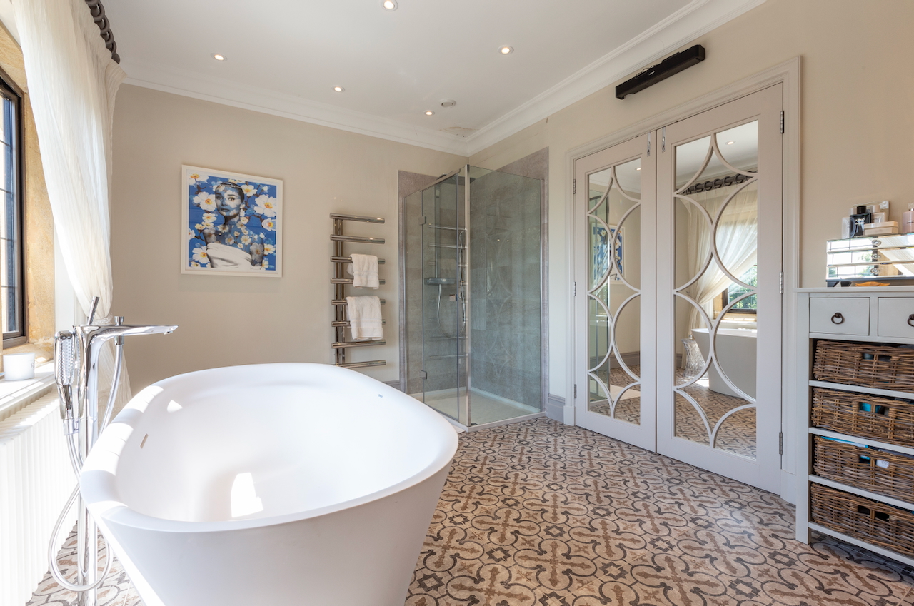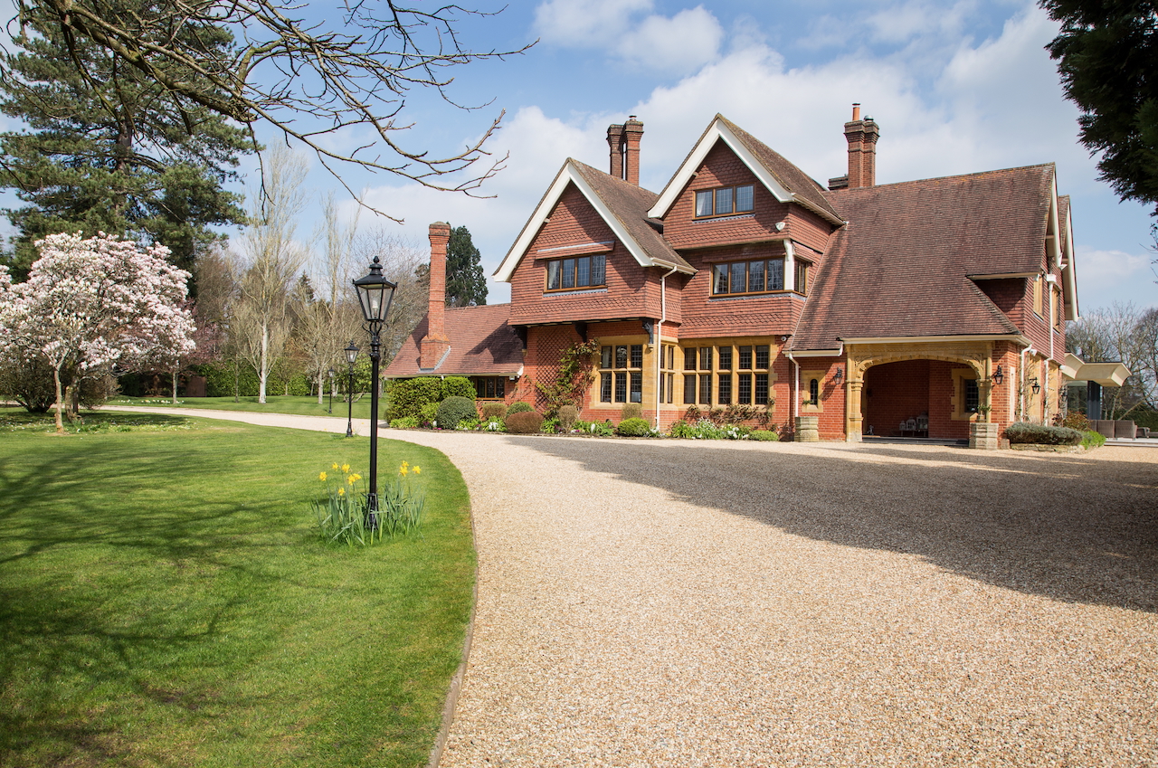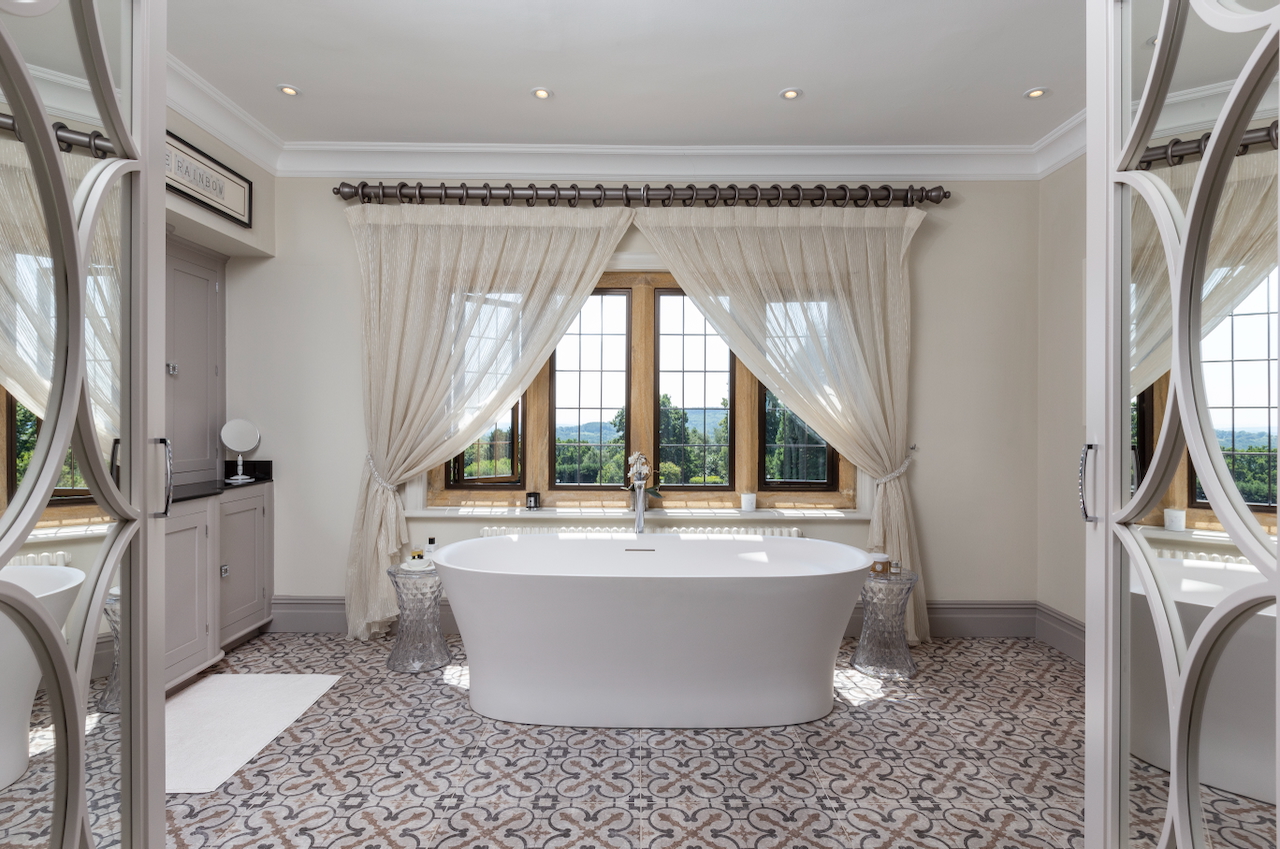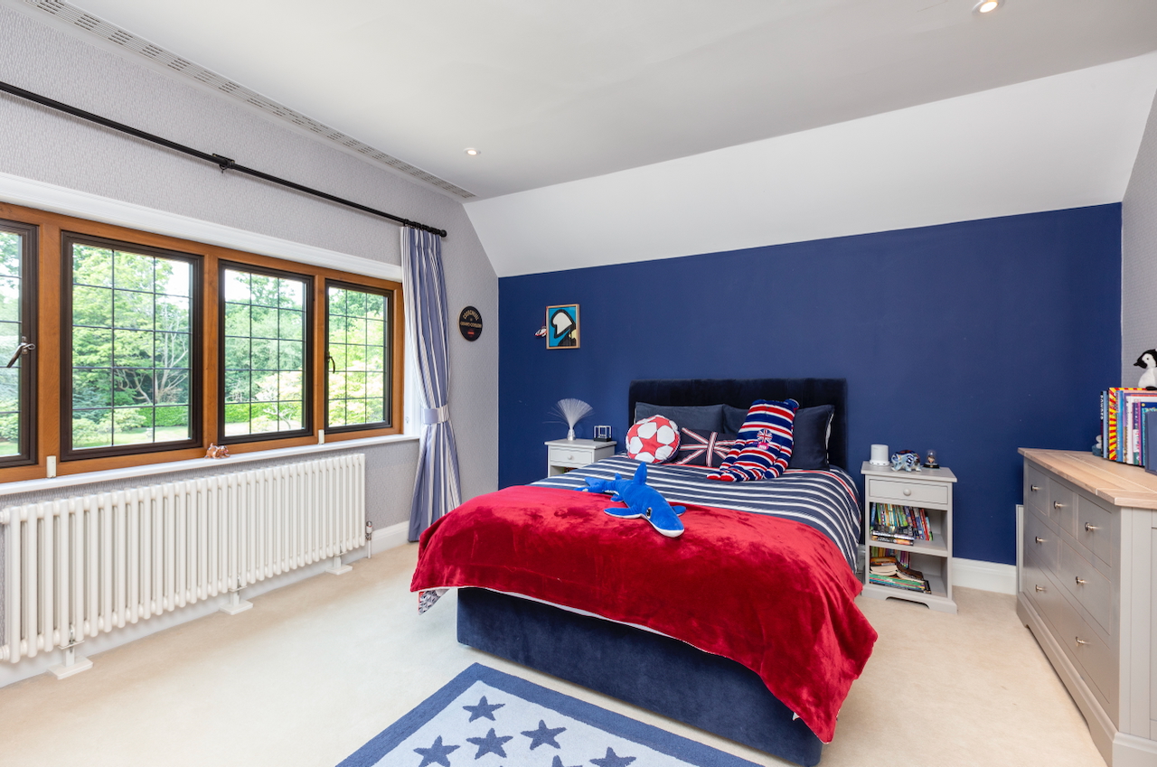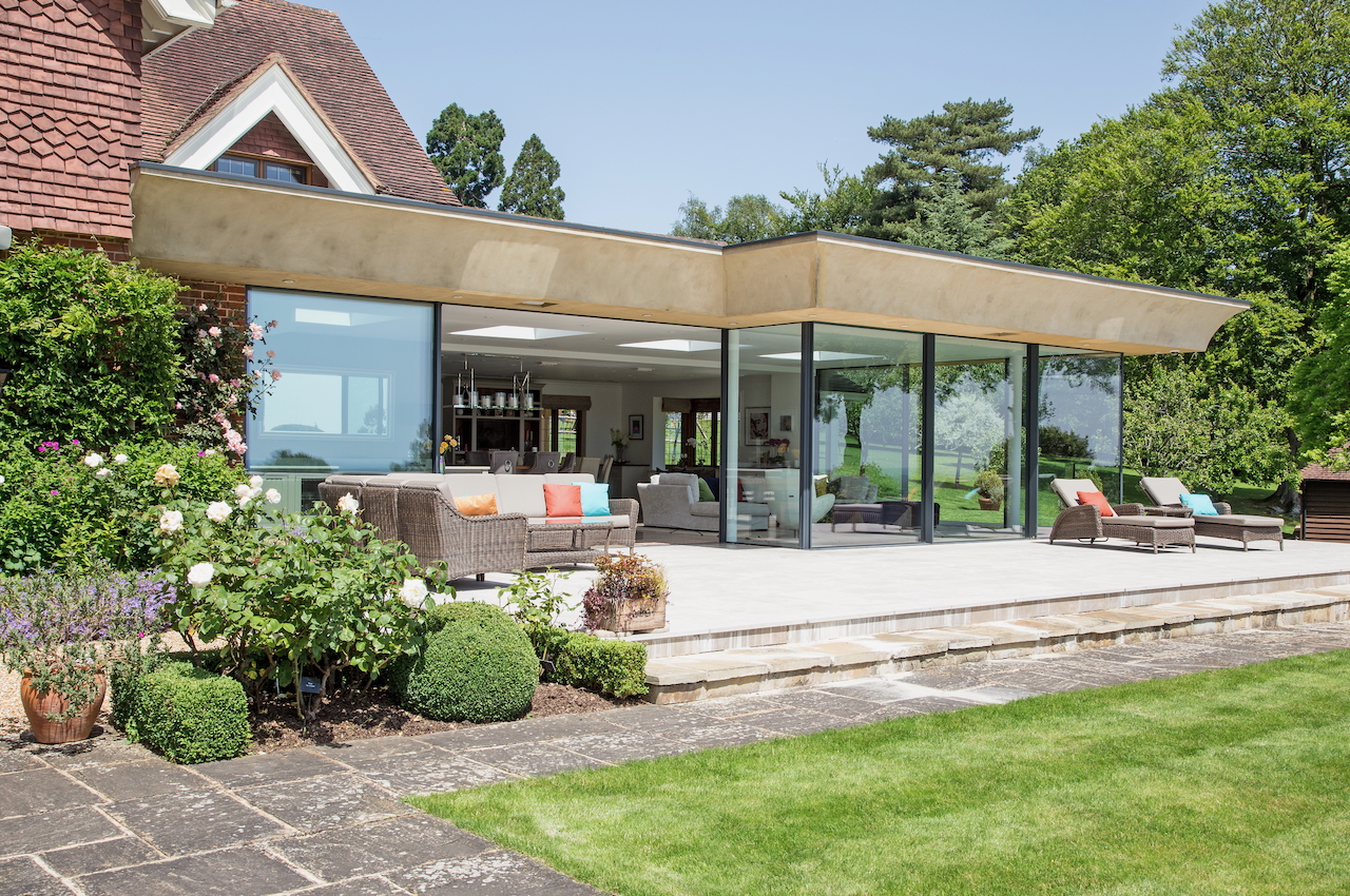 A stunning combination of traditional and an modern glass extension. Large open plan living that opens up to the 10 acre garden with lots of onsite parking, outbuildings and shoot + stay options. Comes with separate indoor pool, gym and tennis court. Located in Surrey.