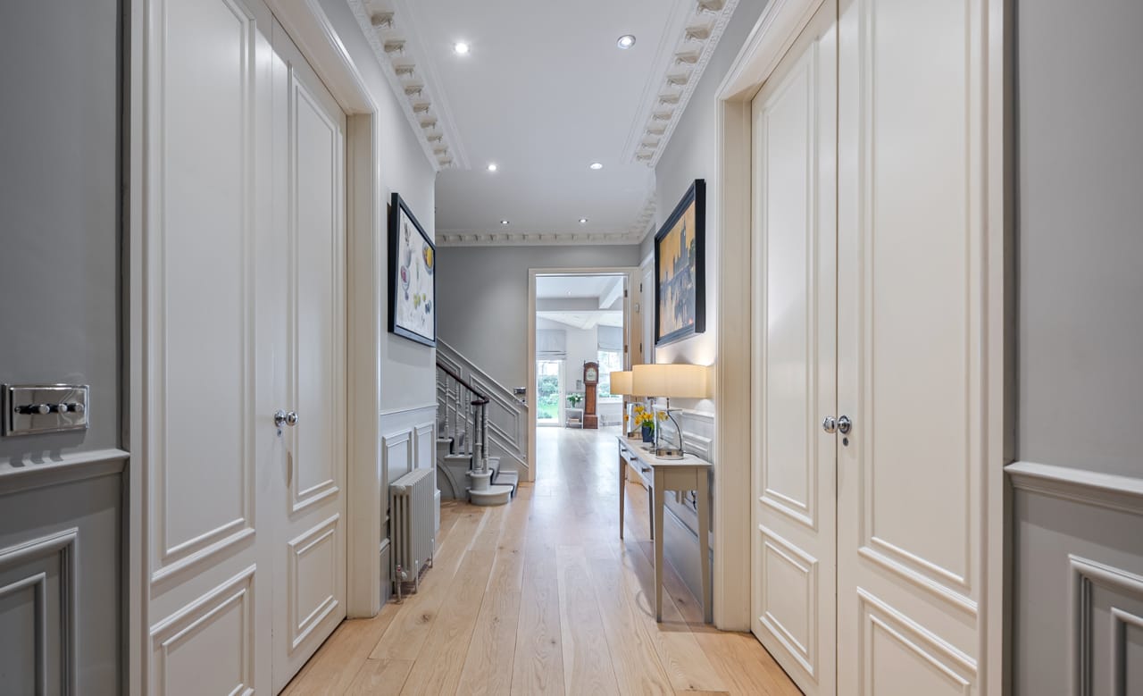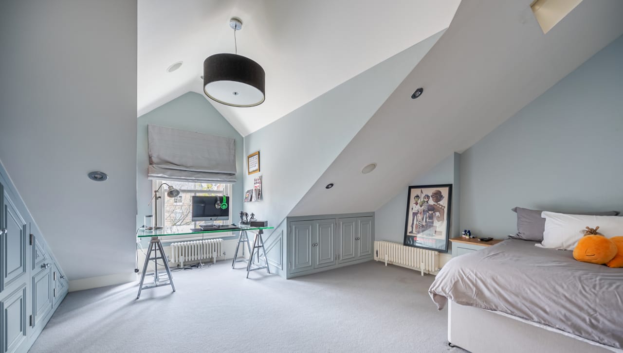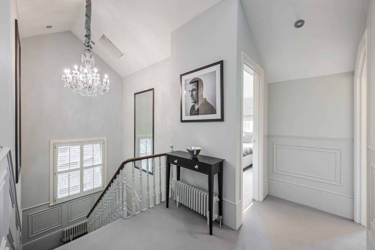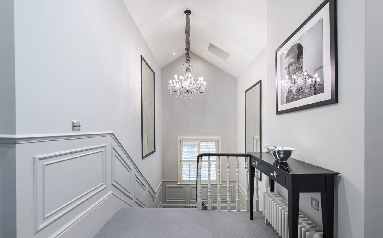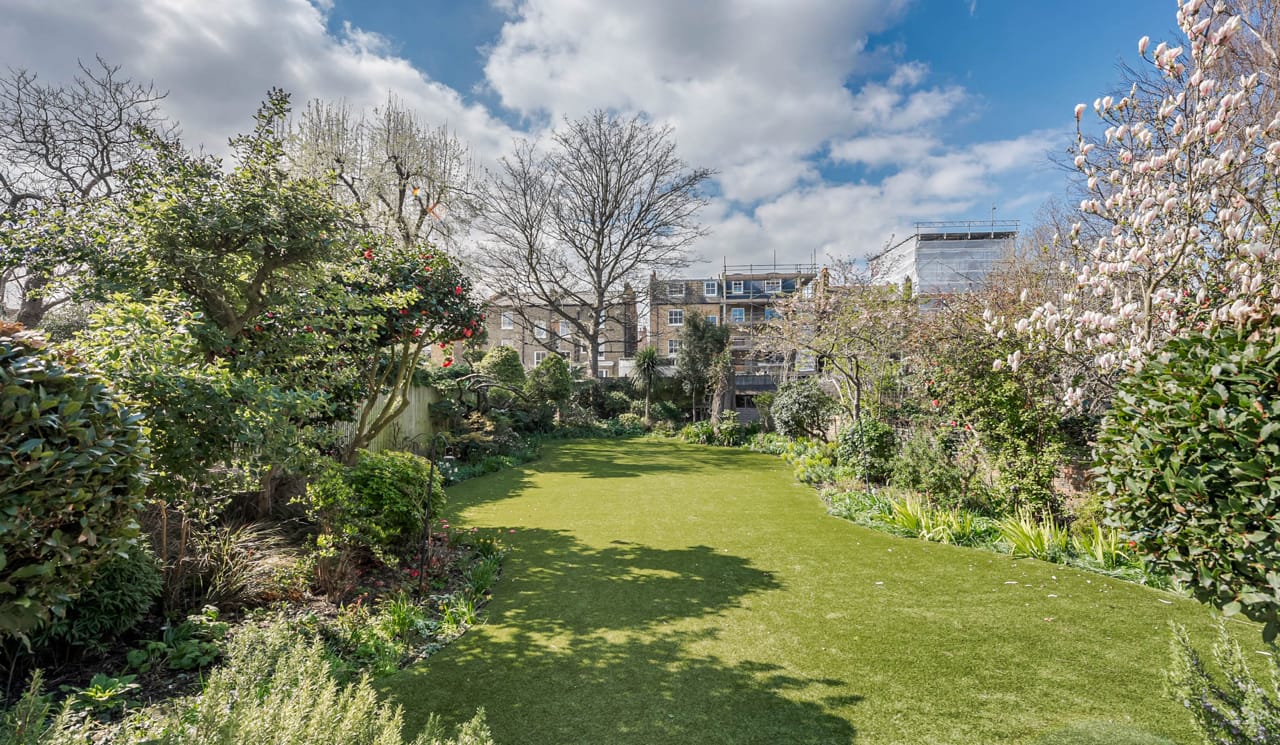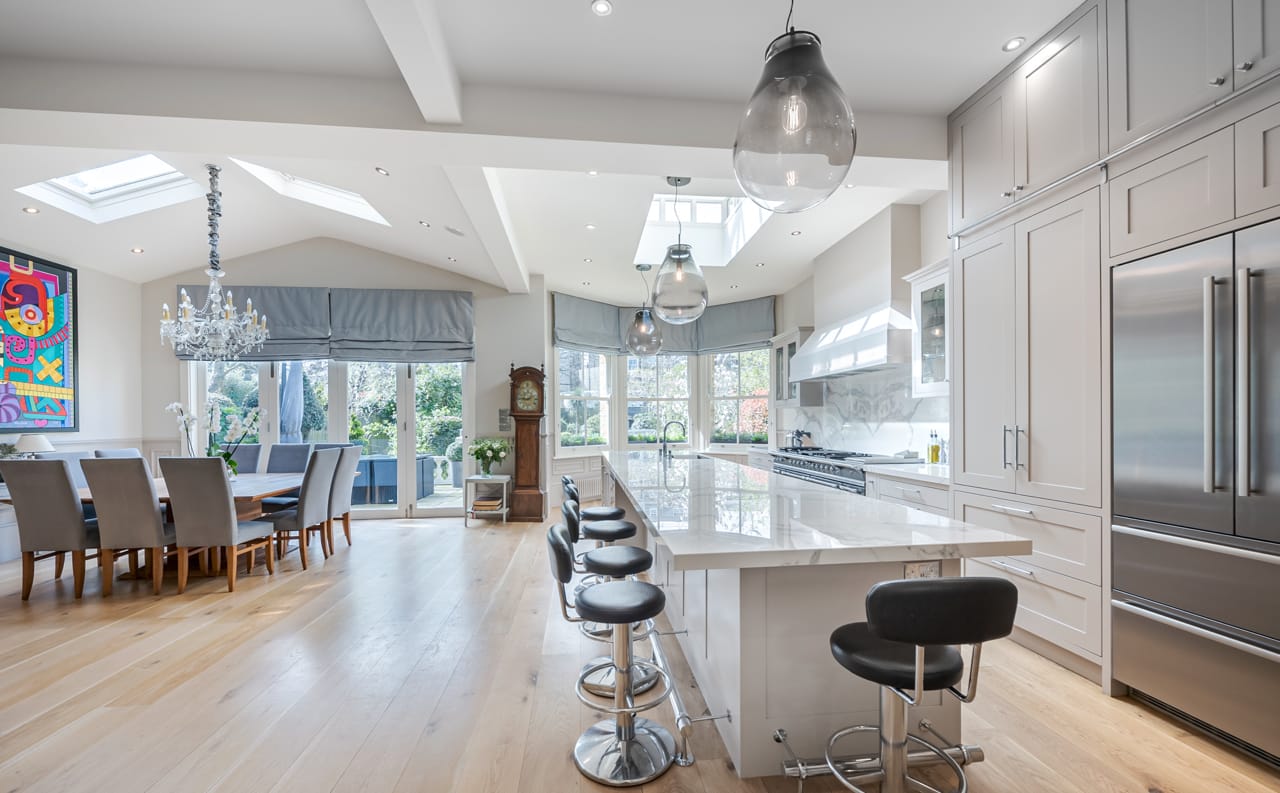 A large Victorian house in Clapham Old Town. It is beautifully decorated with bespoke artwork and soho house-style interior design. The open plan kitchen has a huge island bench and moving ladder on the cupboards. There are french doors opening out onto the outdoor seating and a lovely garden.