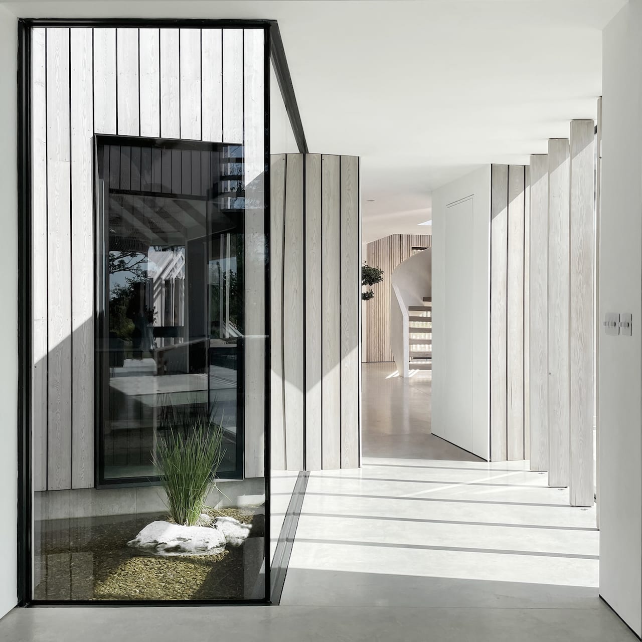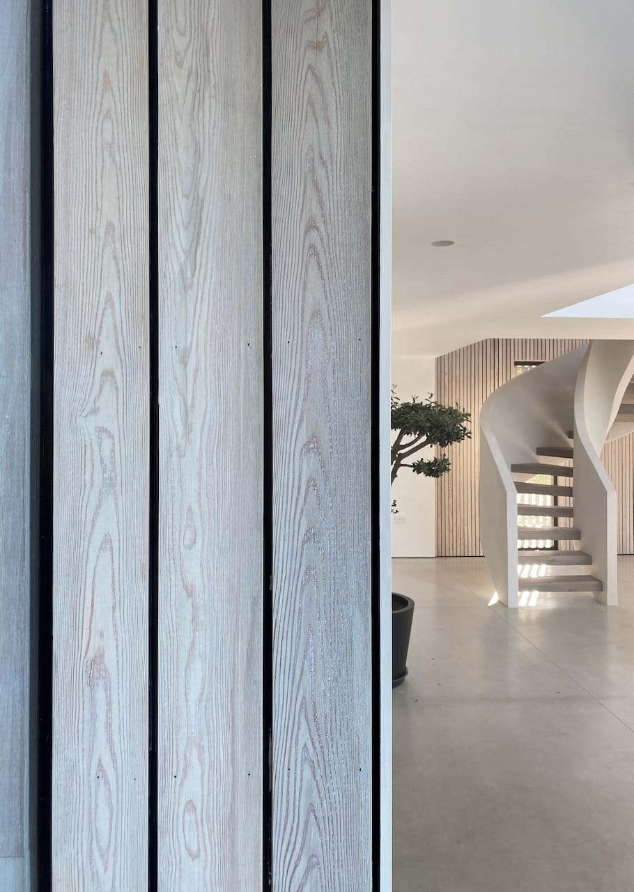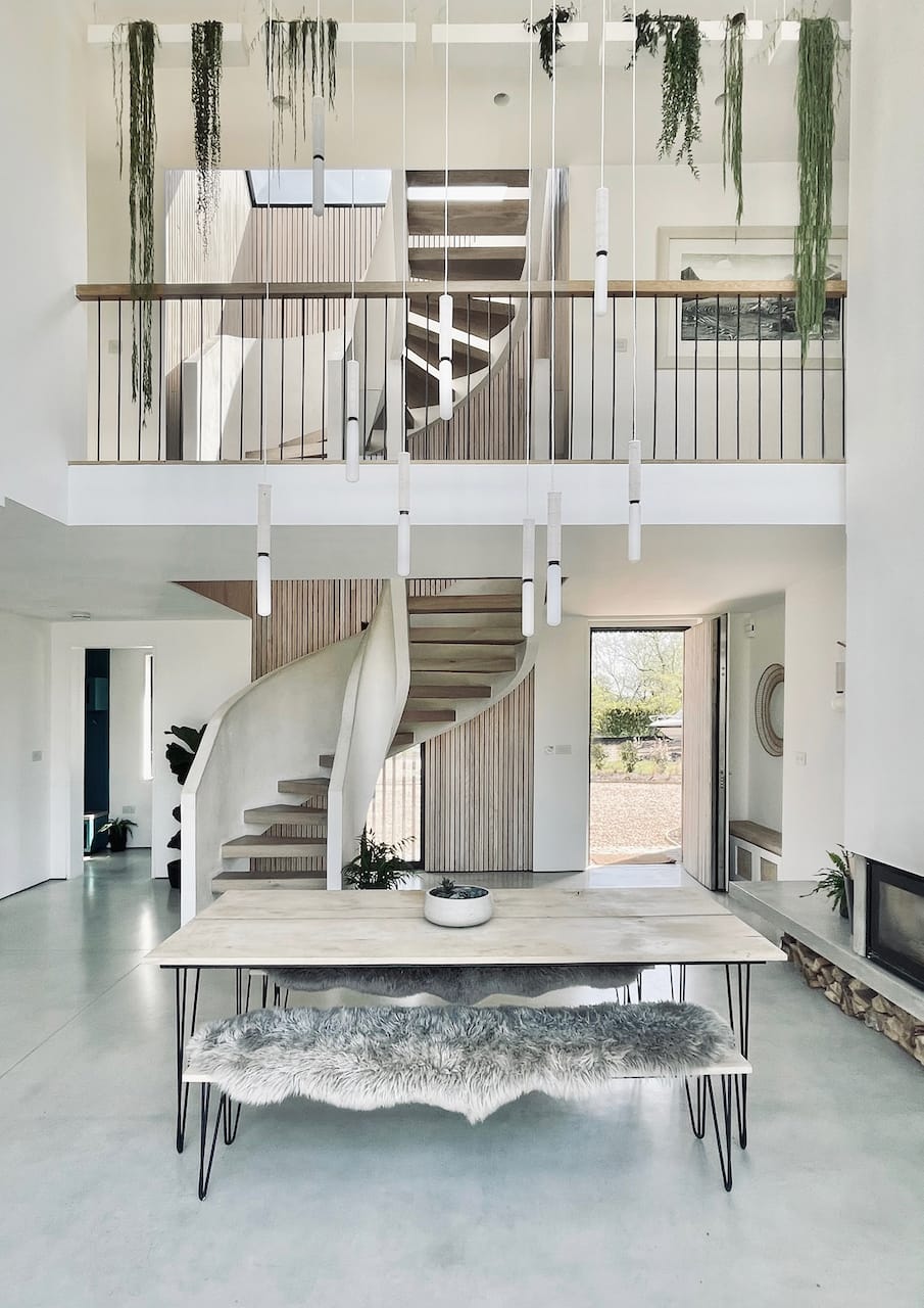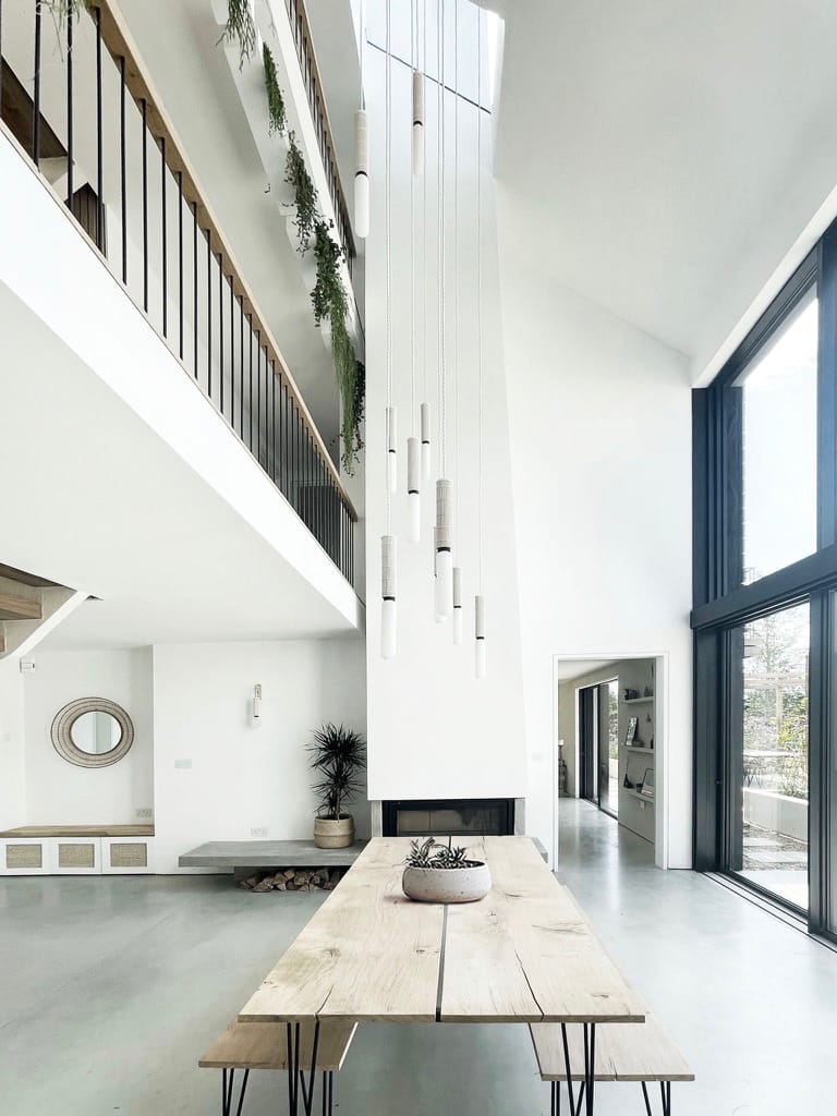 The two parts of the building are connected by a glass link which floats over water. In the middle of the house is a dramatic triple height space over the dining area with floating balconies on the First and Second Floors