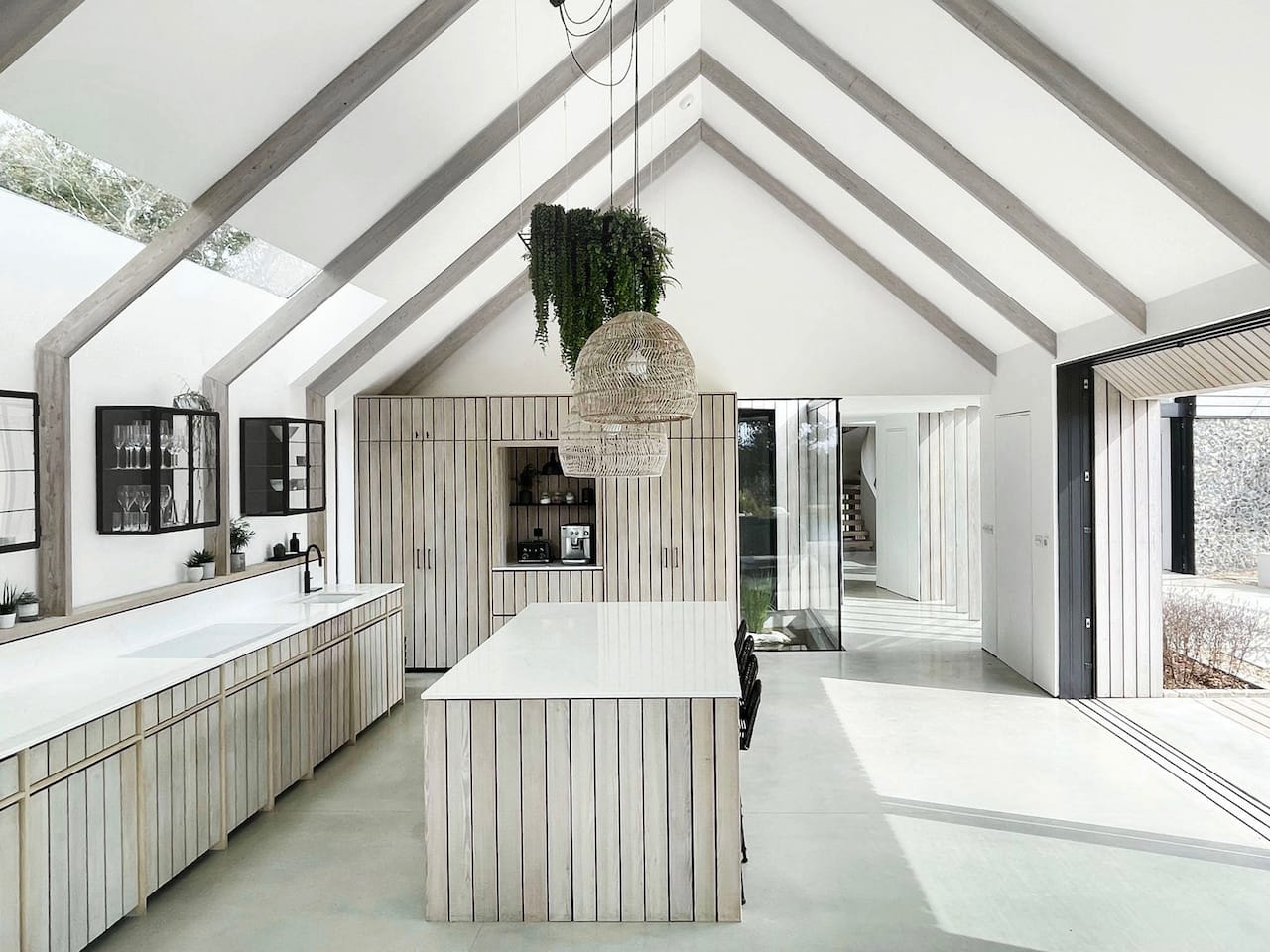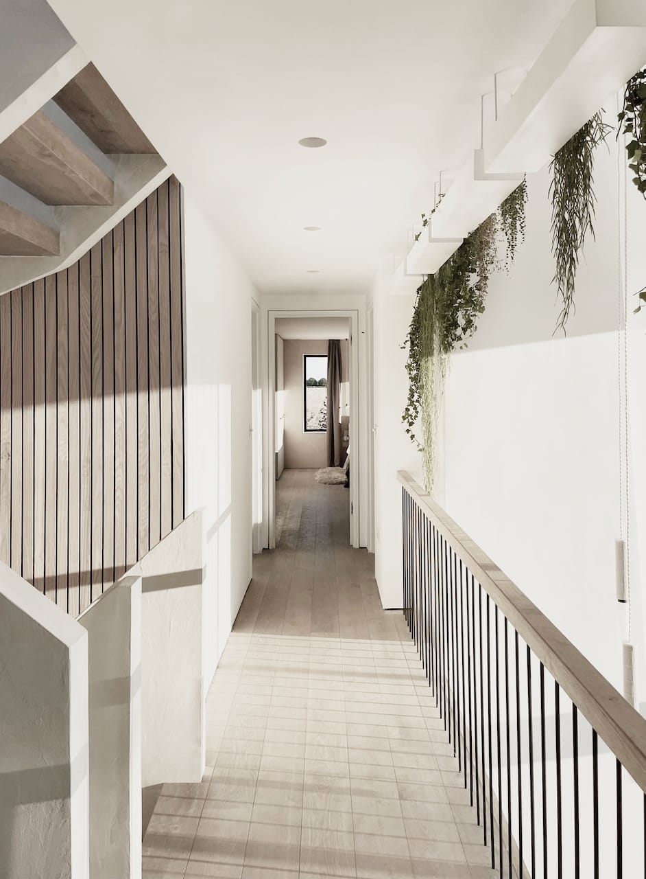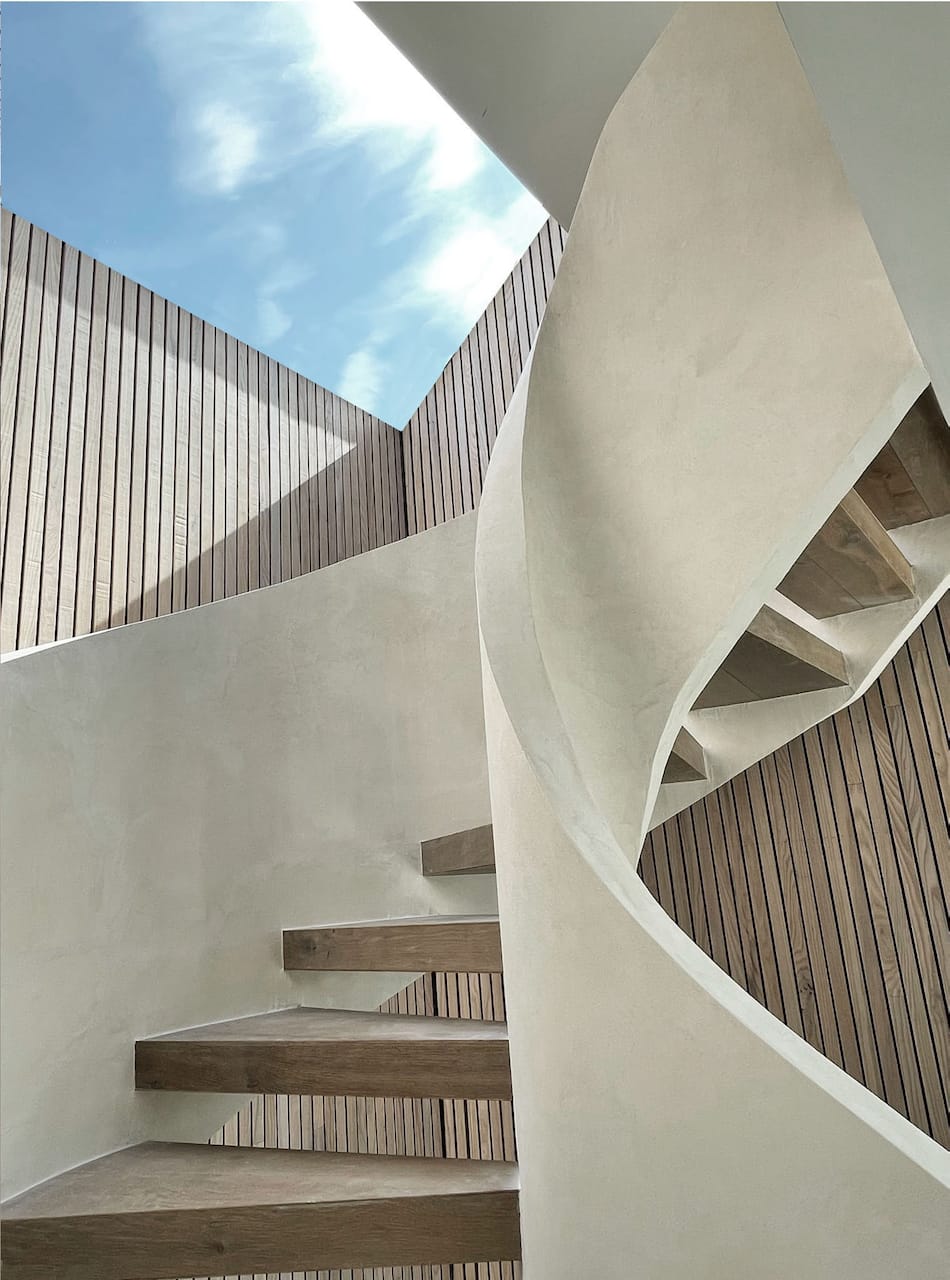 The two parts of the building are connected by a glass link which floats over water. In the middle of the house is a dramatic triple height space over the dining area with floating balconies on the First and Second Floors