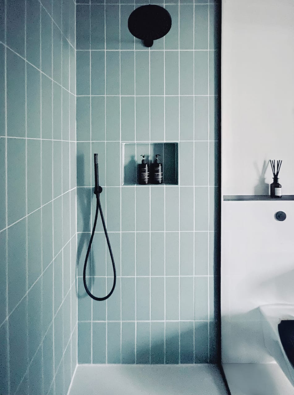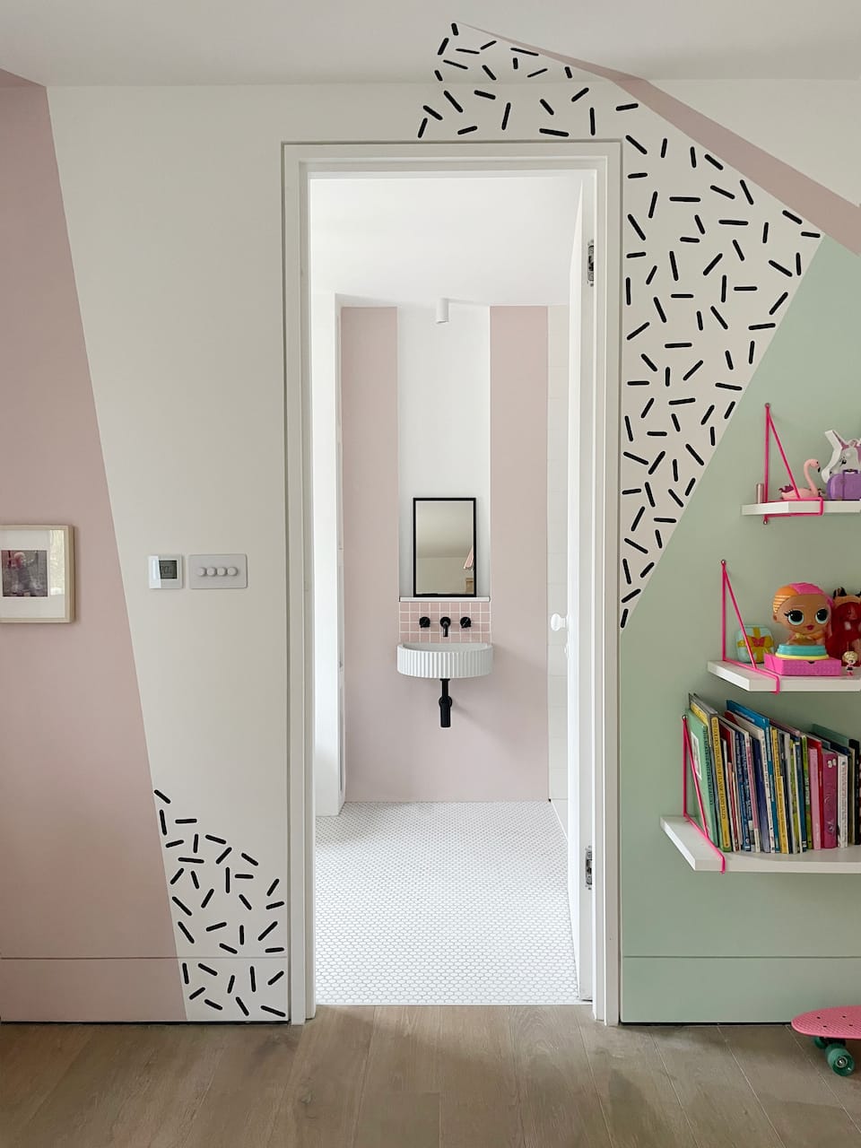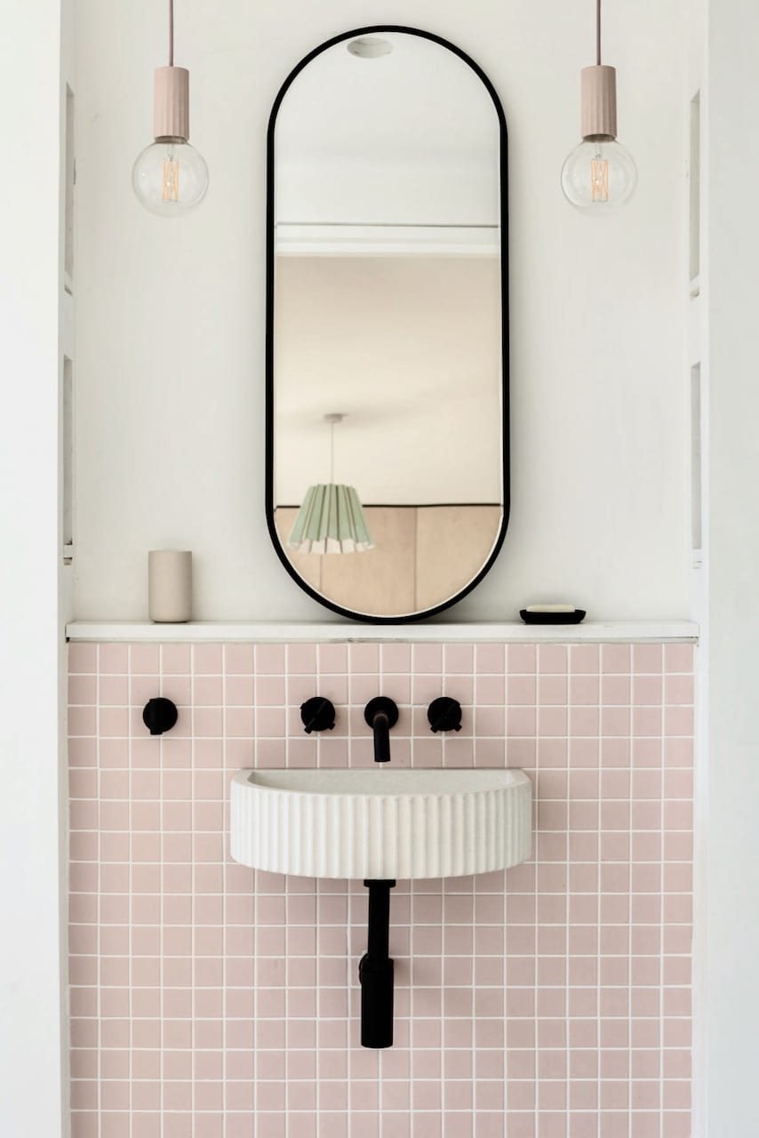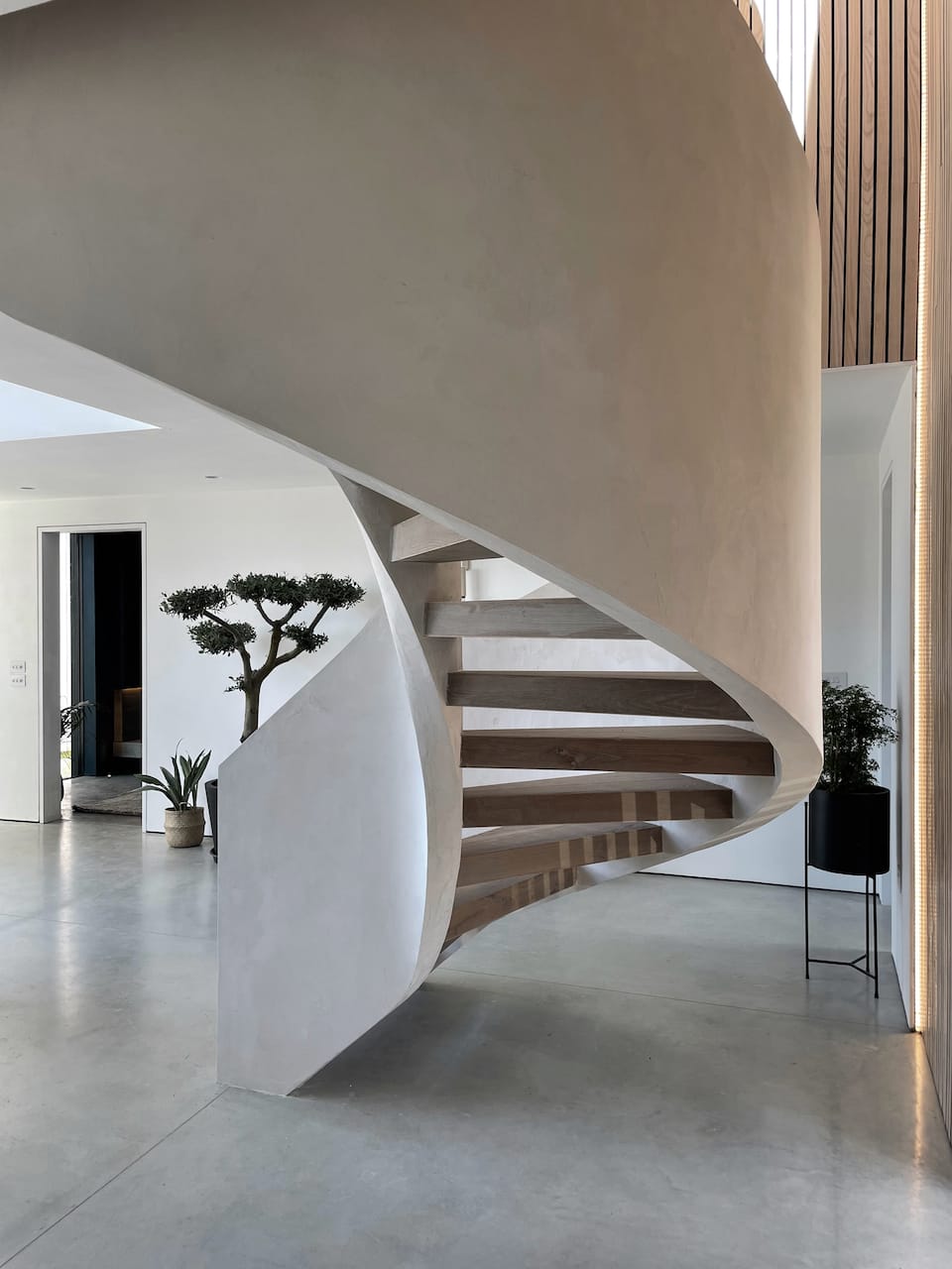 The two parts of the building are connected by a glass link which floats over water. In the middle of the house is a dramatic triple height space over the dining area with floating balconies on the First and Second Floors