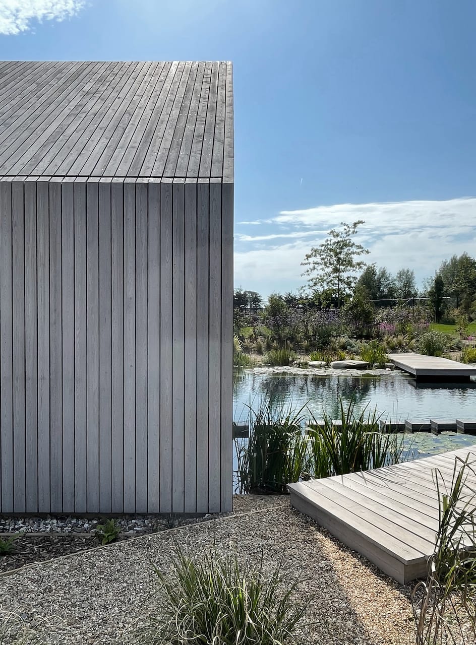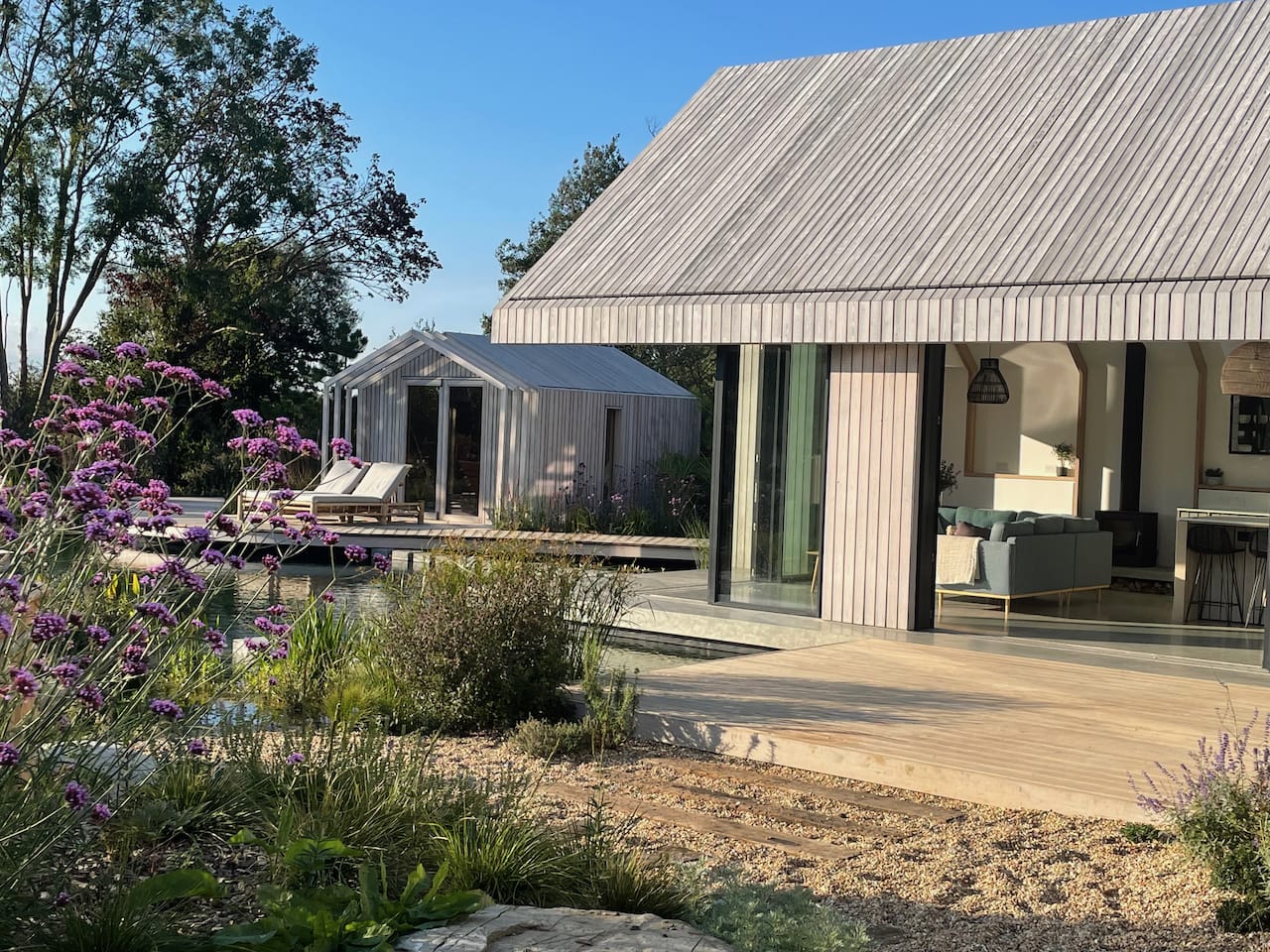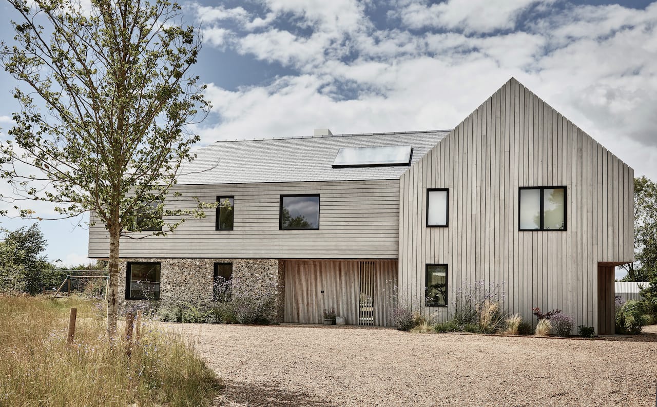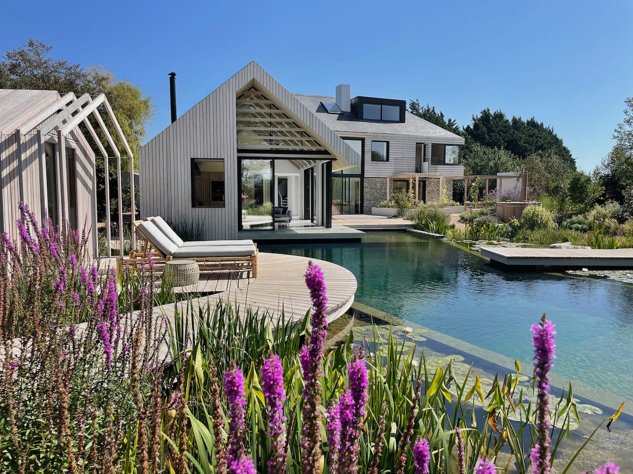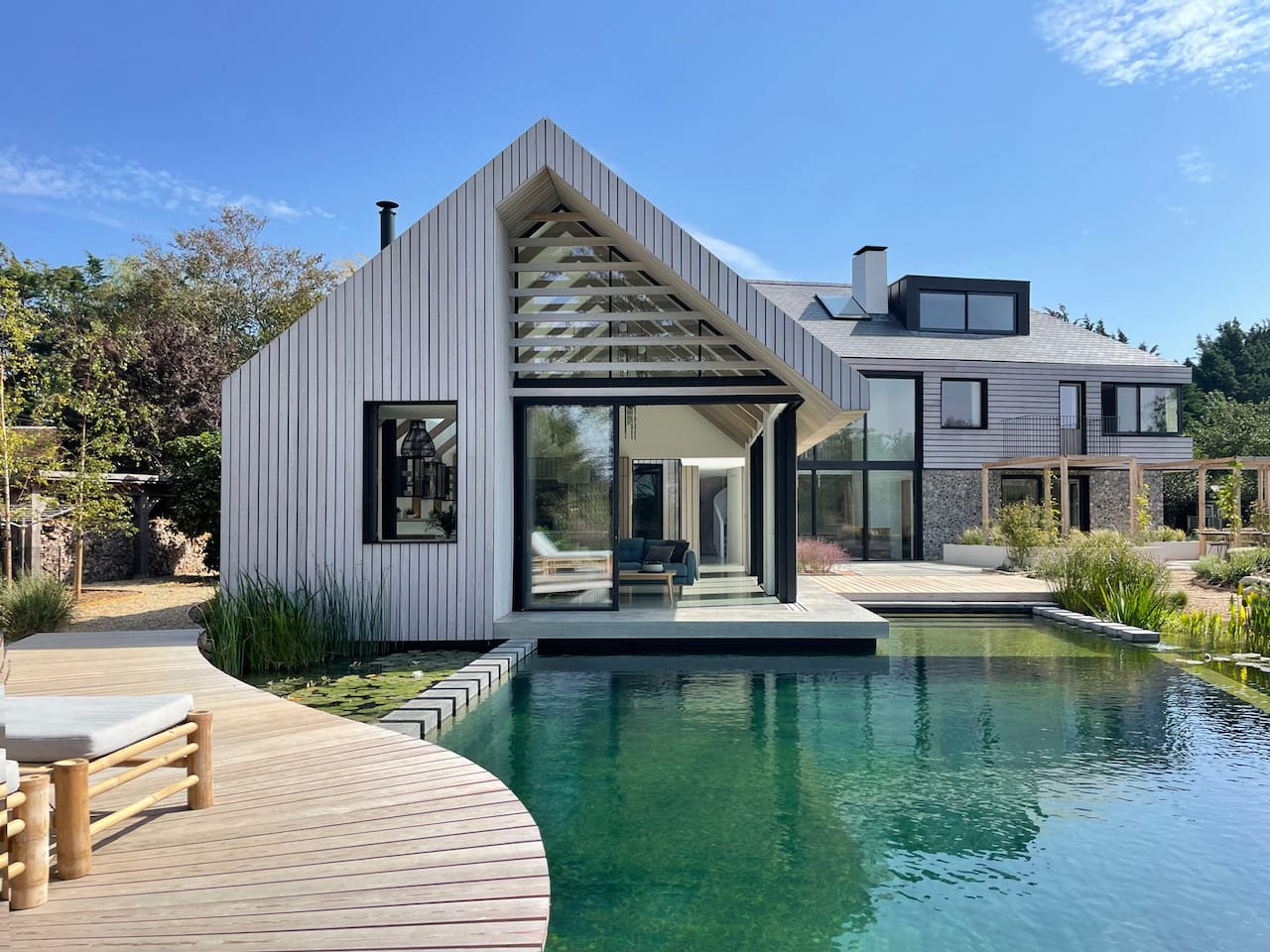 A new-build house on a 1.5 acre site, within both a Site of Special Scientific Interest and a Area of Outstanding Natural Beauty. The main home is formed of two parts; a two storey component anchors into the ground with a flint plinth whilst its smaller single storey sister hovers over a breathtaking Natural Swimming Pond.