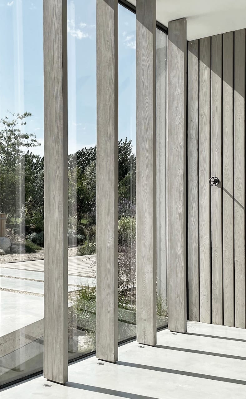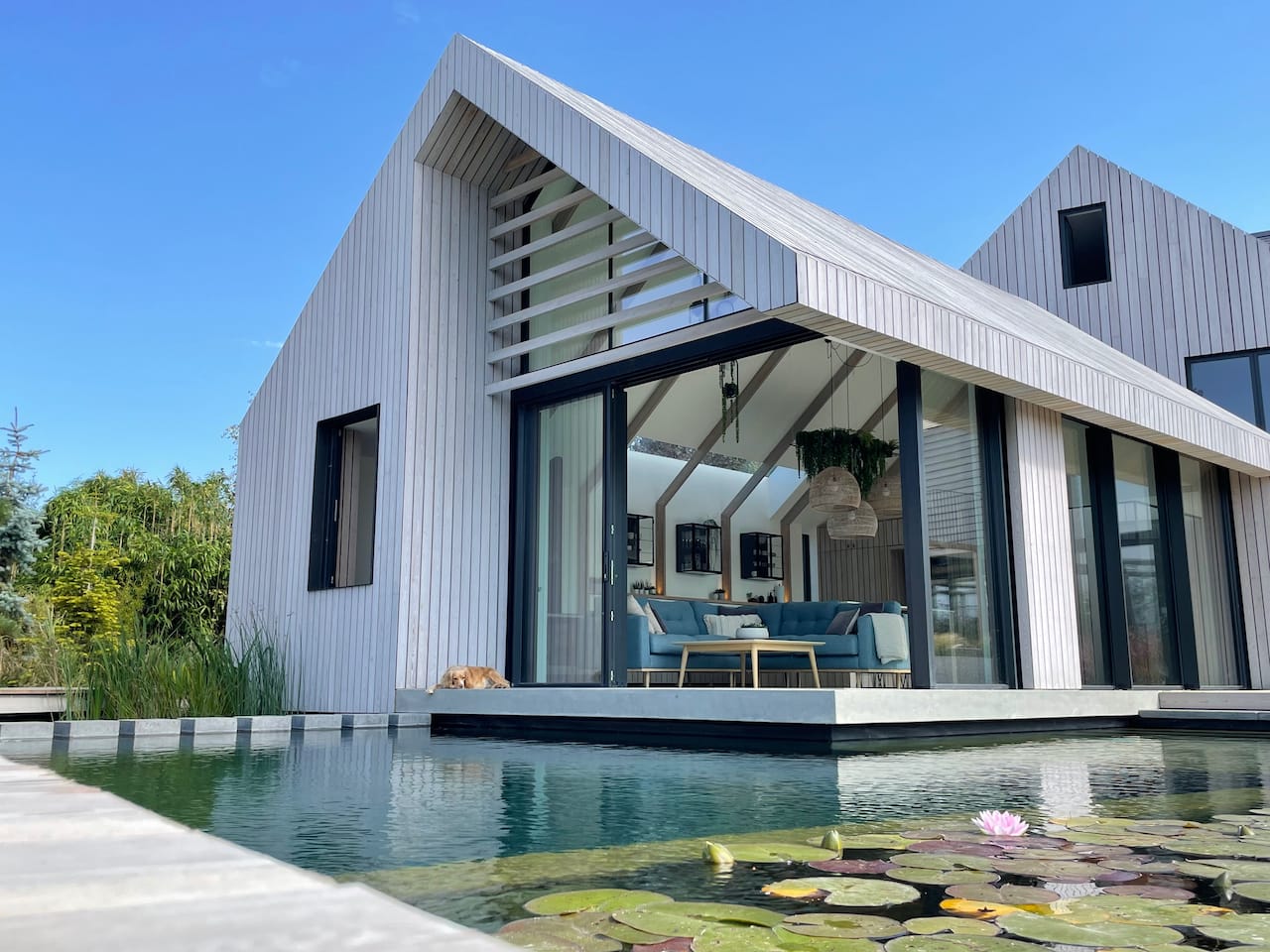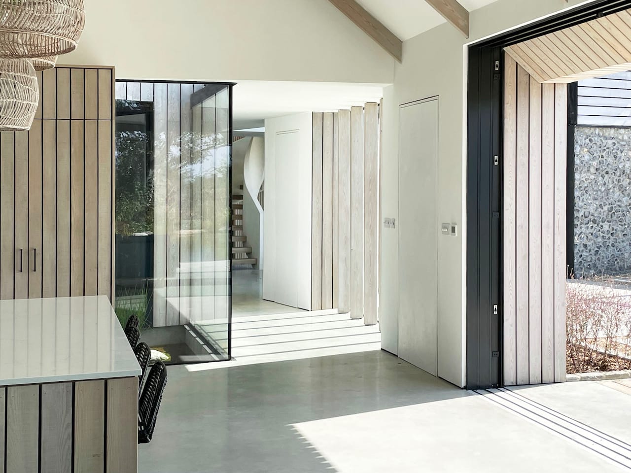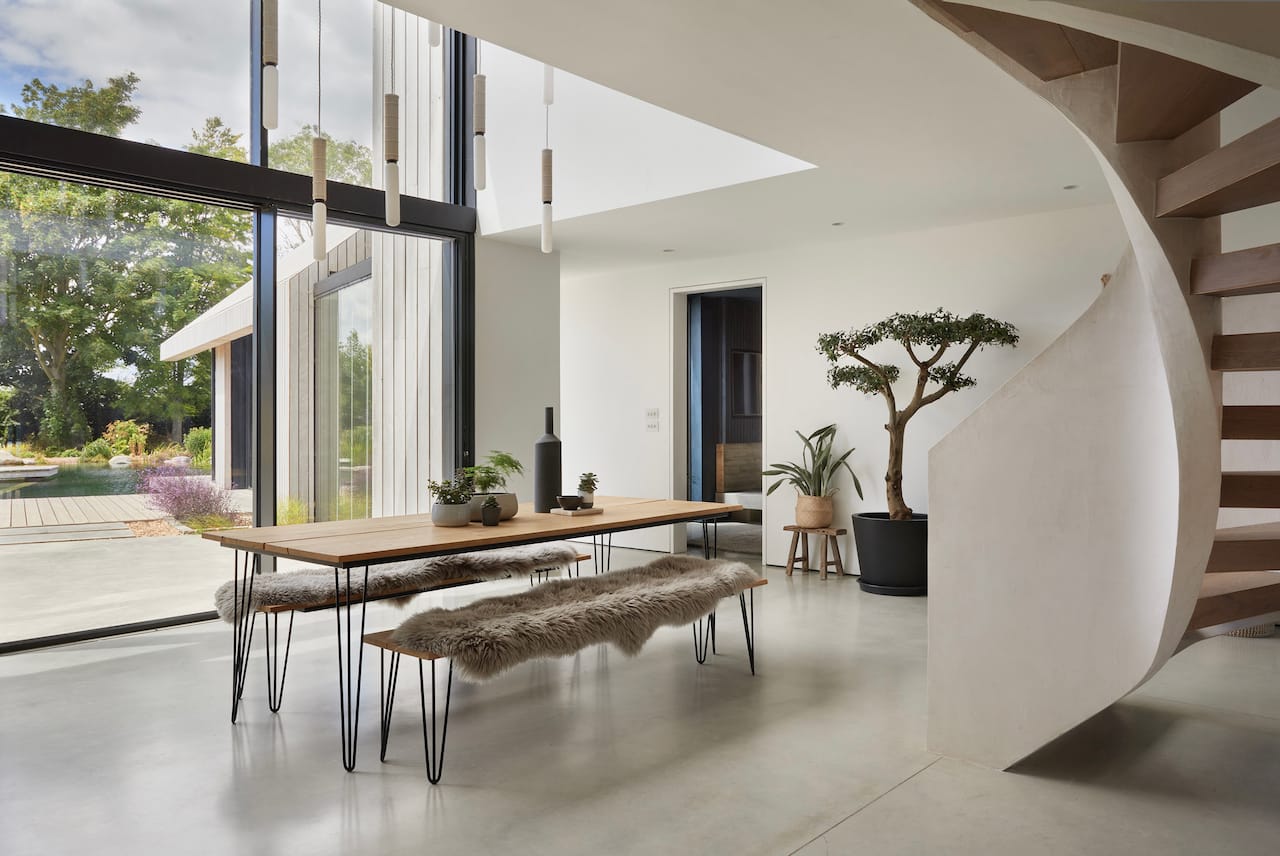 A new-build house on a 1.5 acre site, within both a Site of Special Scientific Interest and a Area of Outstanding Natural Beauty. The main home is formed of two parts; a two storey component anchors into the ground with a flint plinth whilst its smaller single storey sister hovers over a breathtaking Natural Swimming Pond.