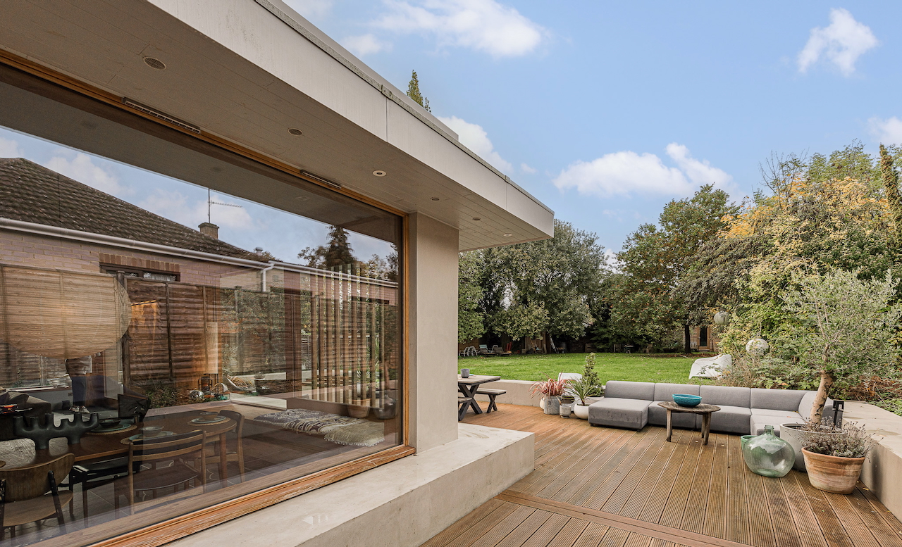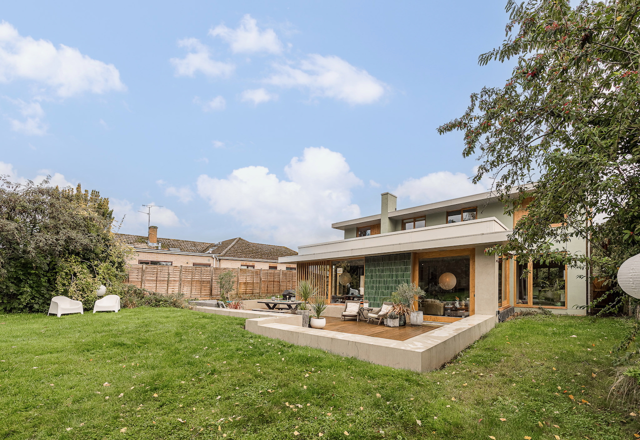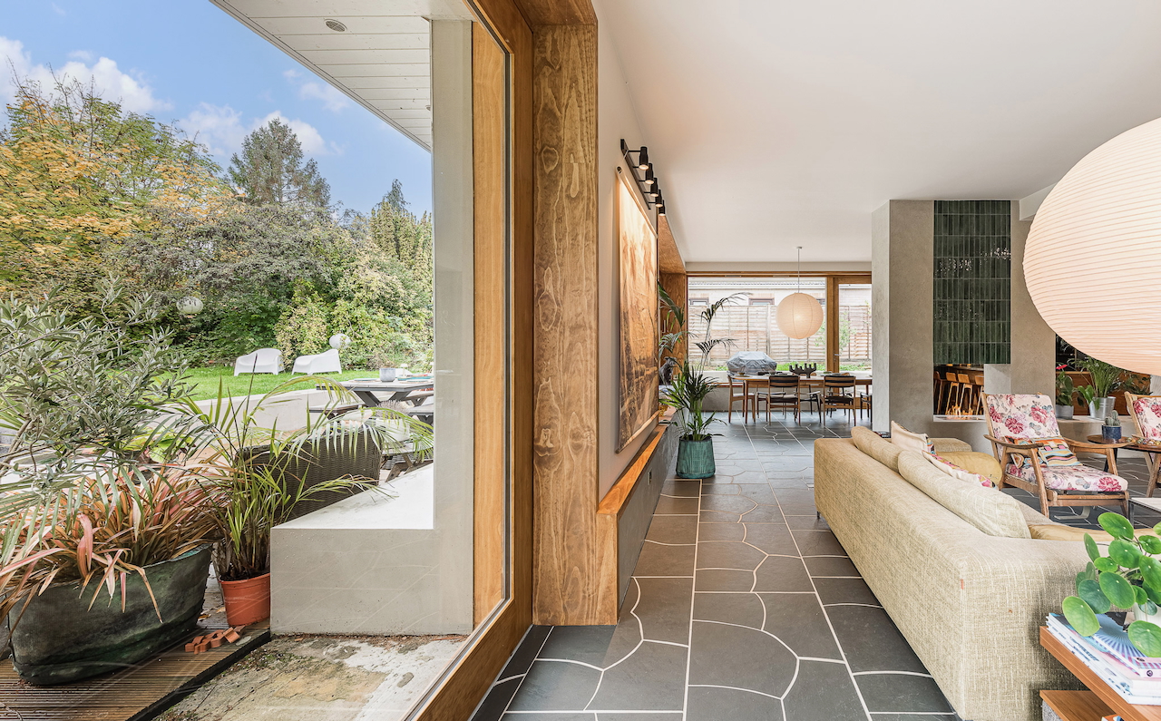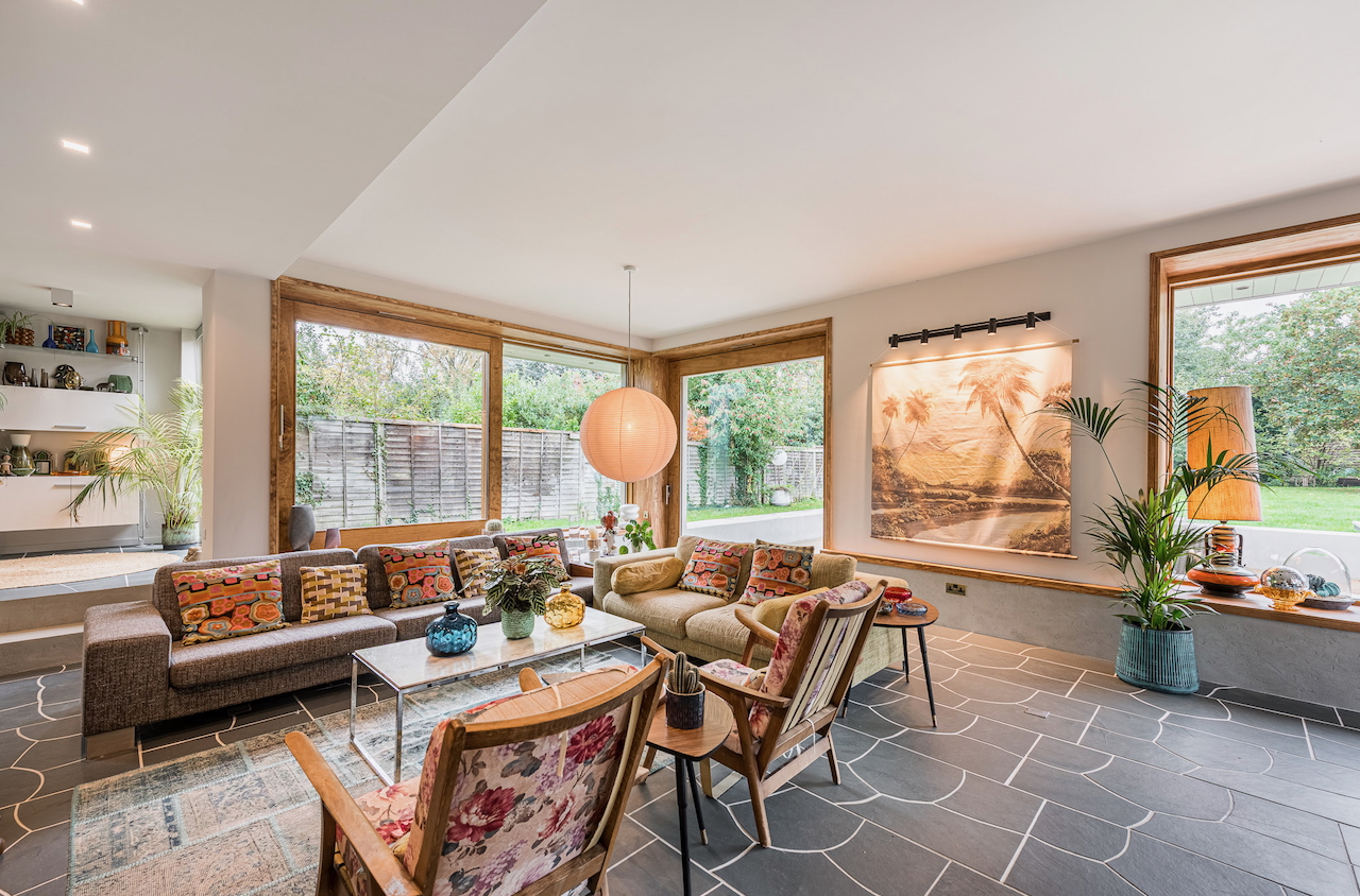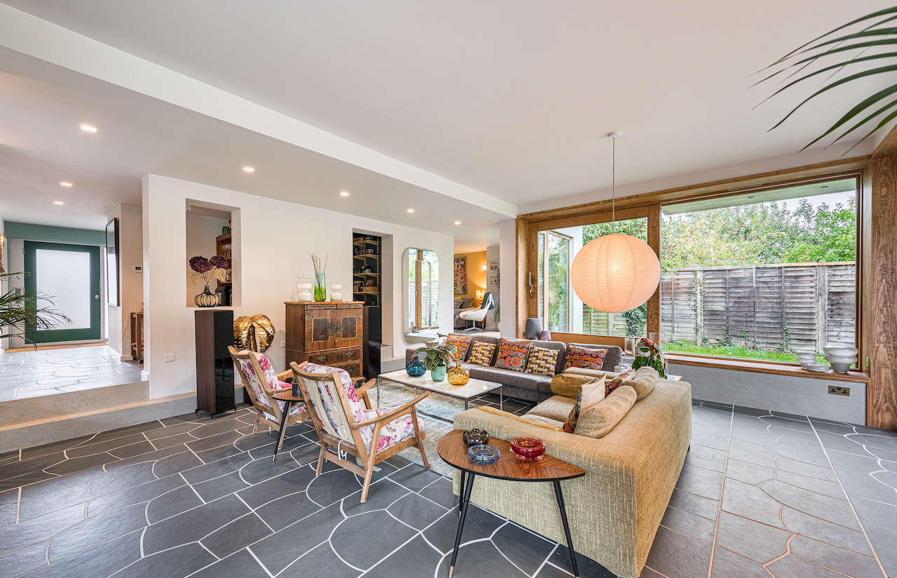 An architecturally designed shoot home featuring Mid-Century Modern decor and huge, open living space with mixed natural materials; hand cut slate crazy paving and wood-slatted windows and a large garden space with wooden terrace. It has high ceilings and lots of natural light. Located in Henley-Upon-Thames.