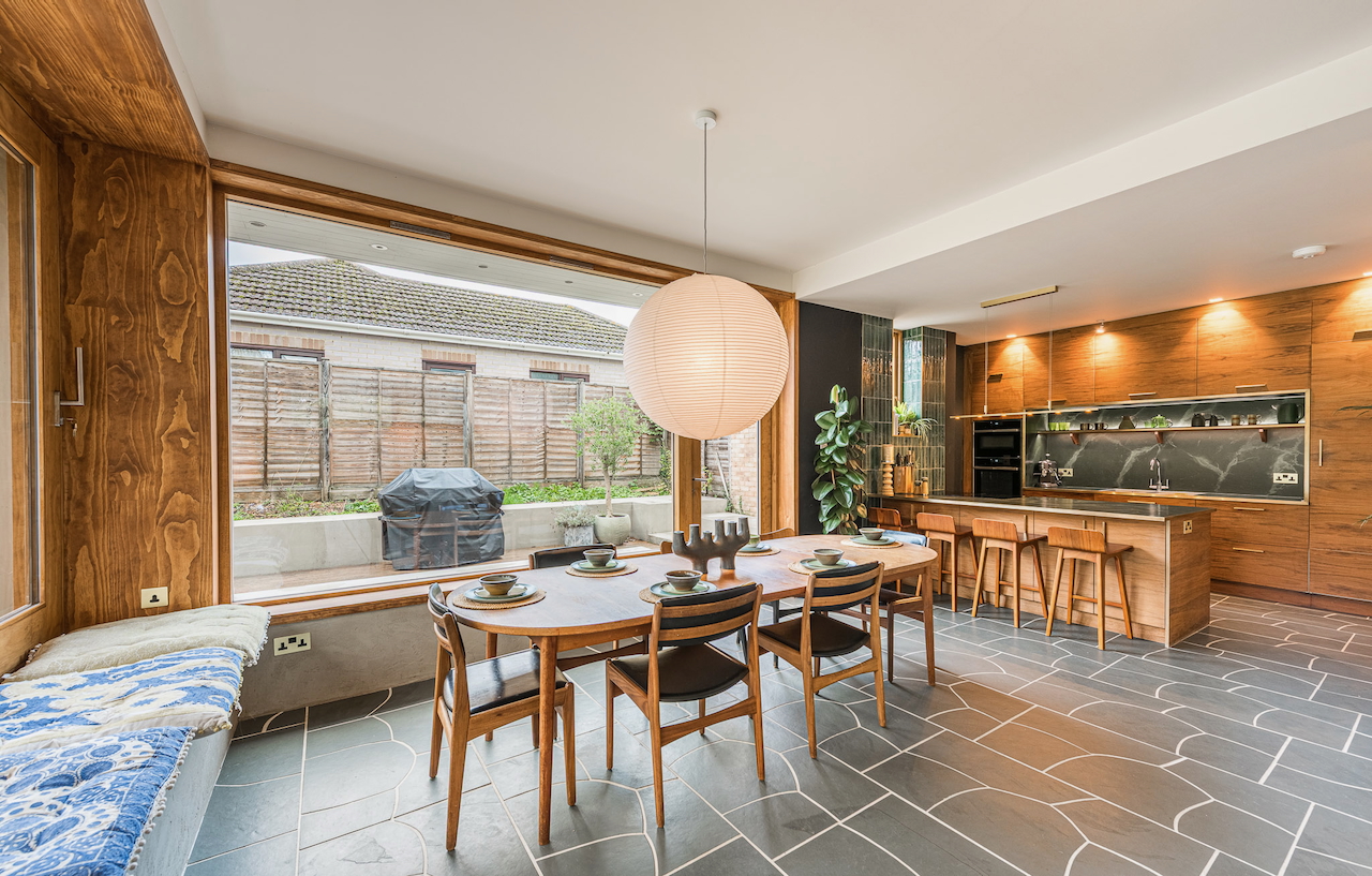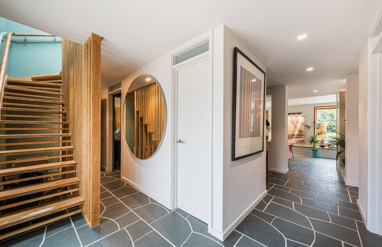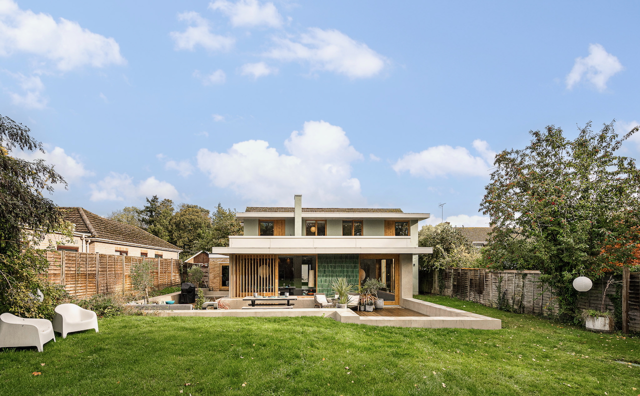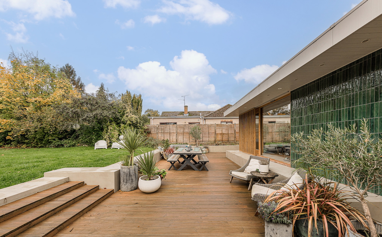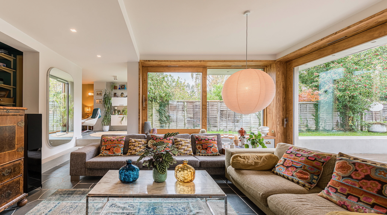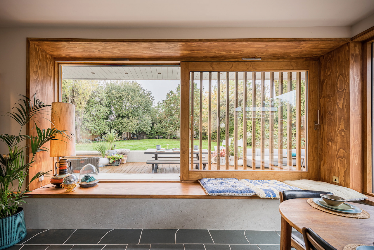 An architecturally designed shoot home featuring Mid-Century Modern decor and huge, open living space with mixed natural materials; hand cut slate crazy paving and wood-slatted windows and a large garden space with wooden terrace. It has high ceilings and lots of natural light. Located in Henley-Upon-Thames.