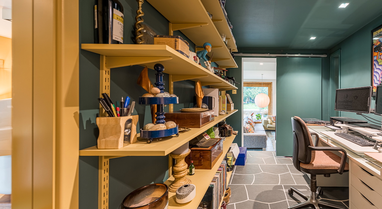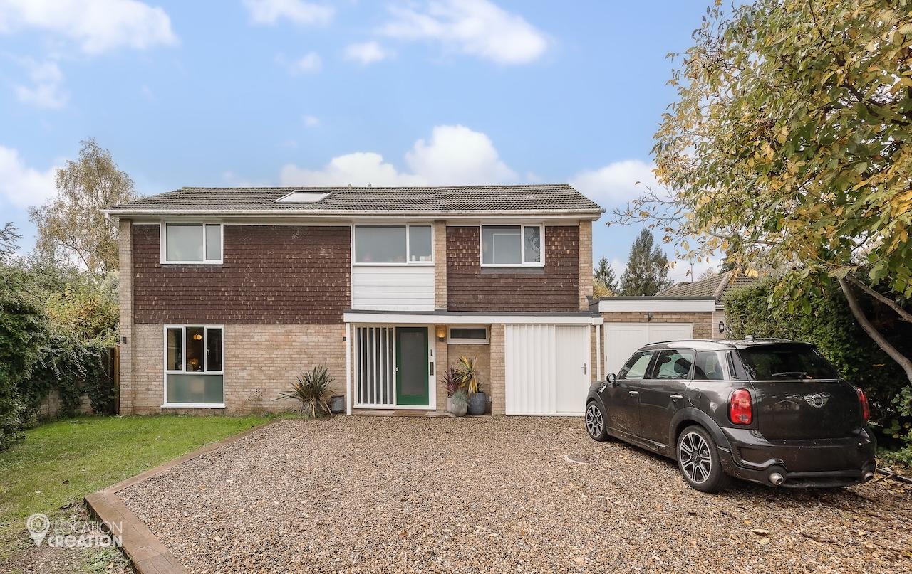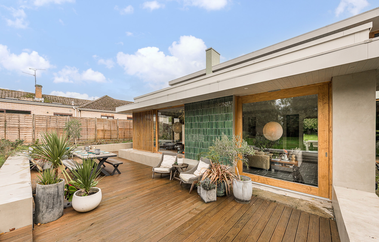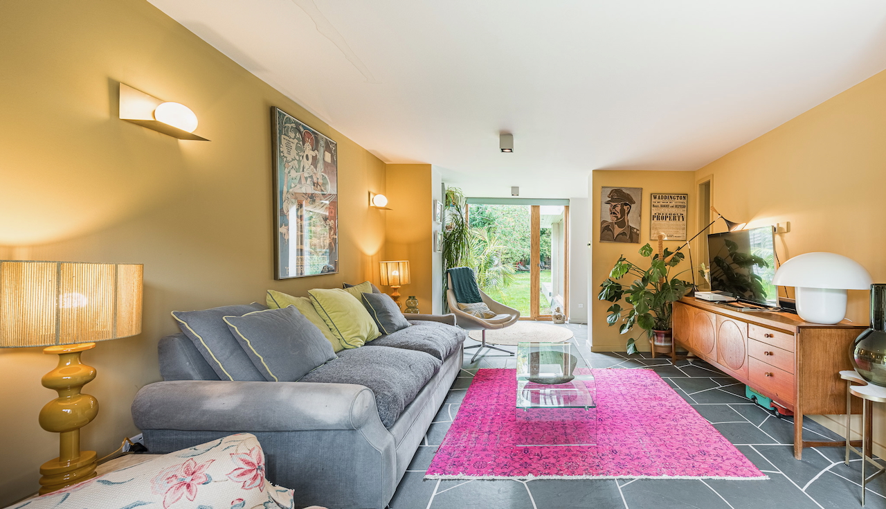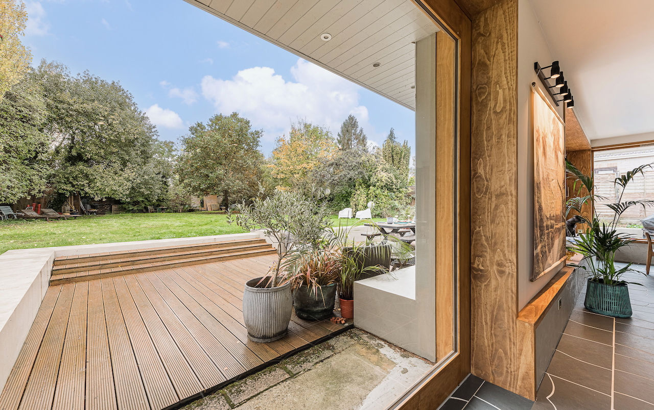 An architecturally designed shoot home featuring Mid-Century Modern decor and huge, open living space with mixed natural materials; hand cut slate crazy paving and wood-slatted windows and a large garden space with wooden terrace. It has high ceilings and lots of natural light. Located in Henley-Upon-Thames.