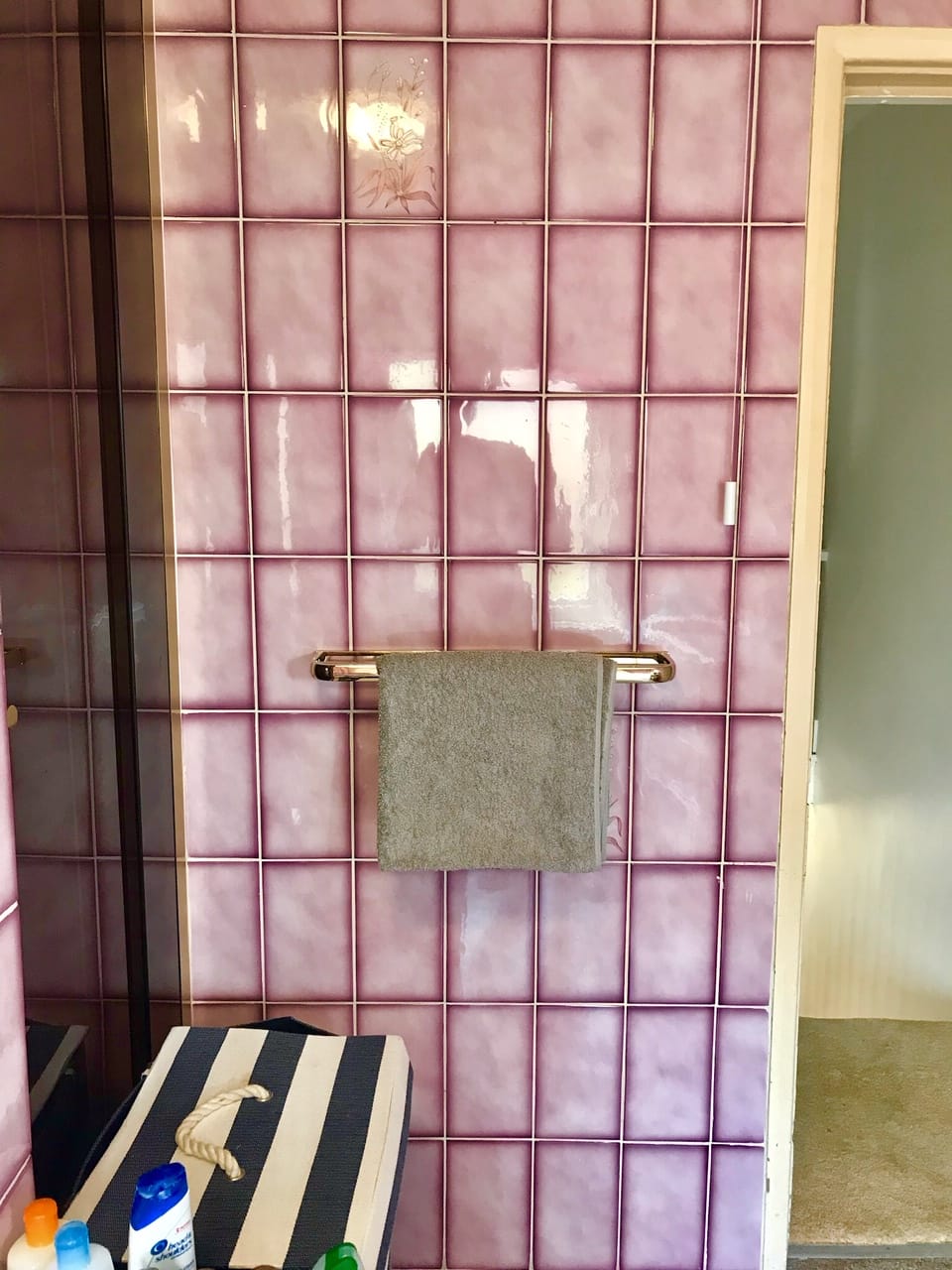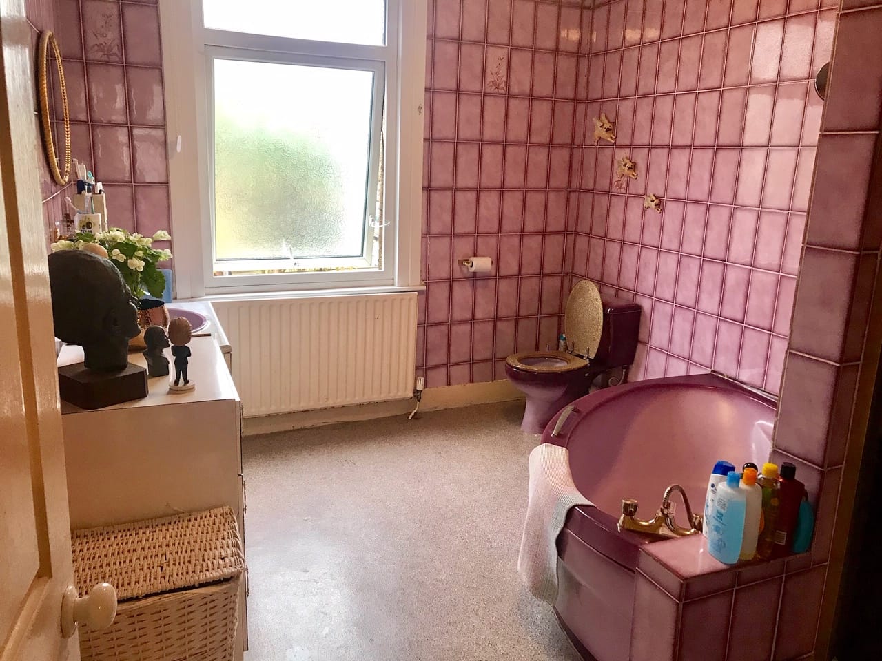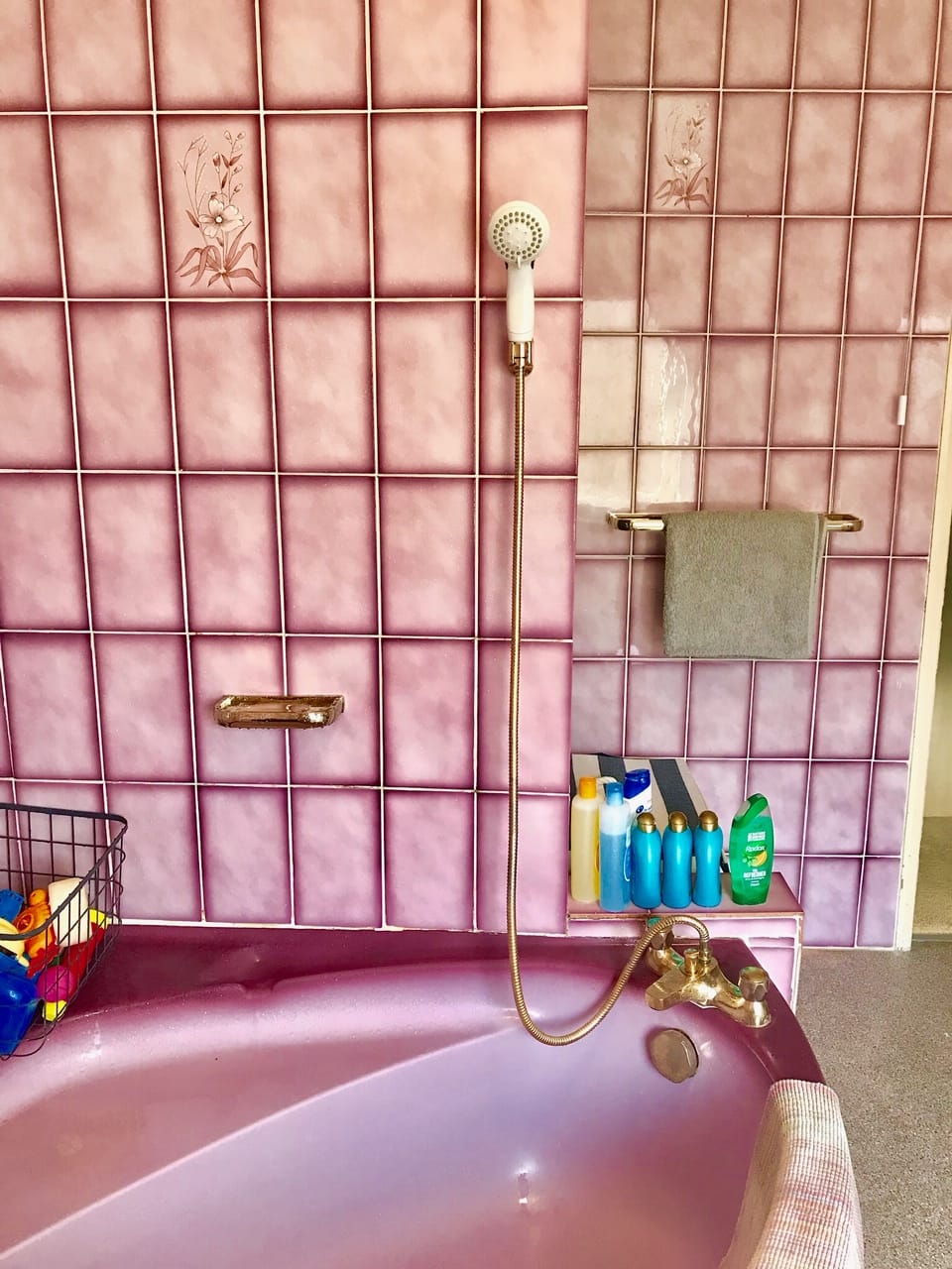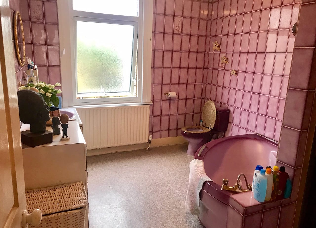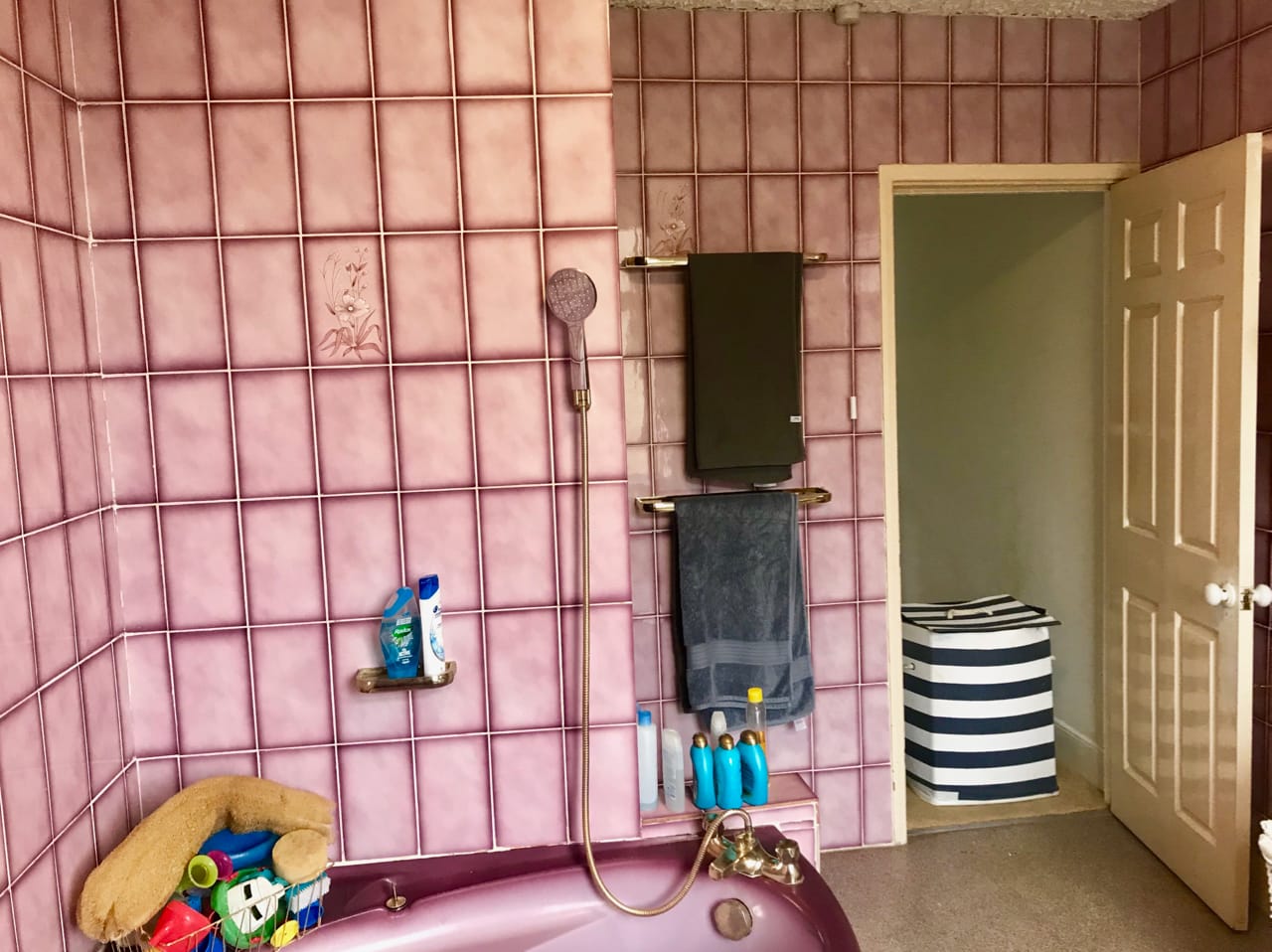 Amazing Pink retro bathroom, with retro touches! Located in East London.