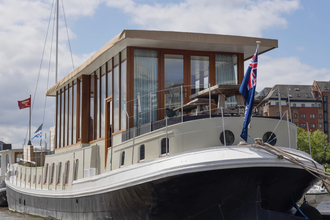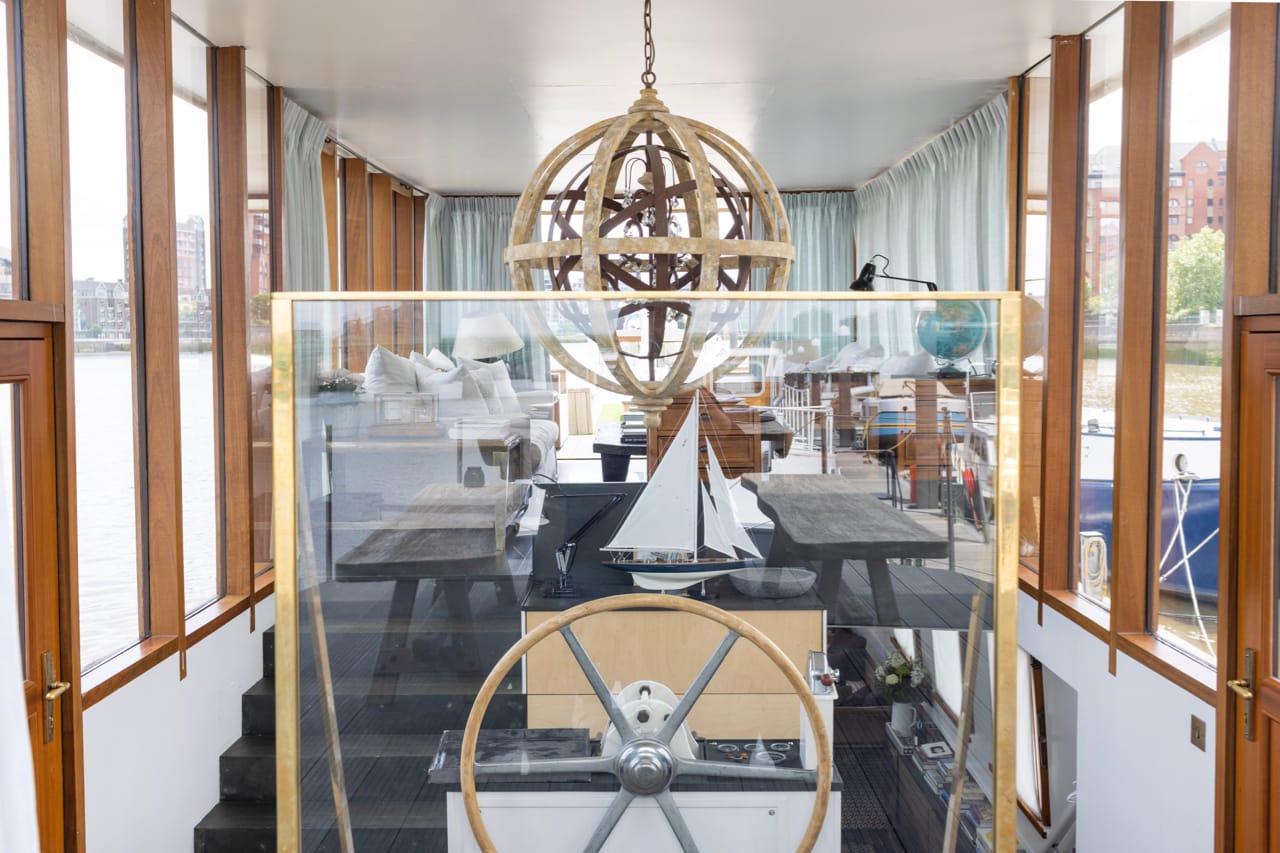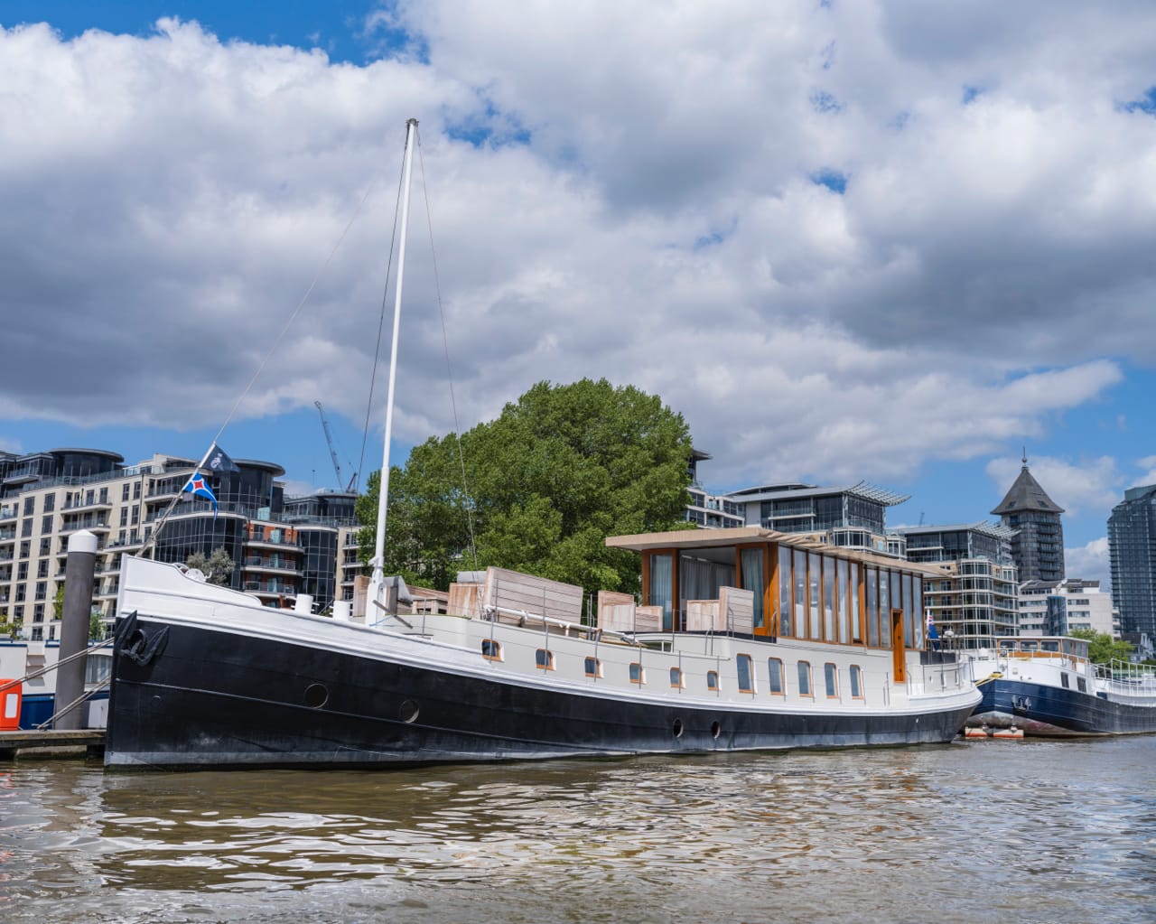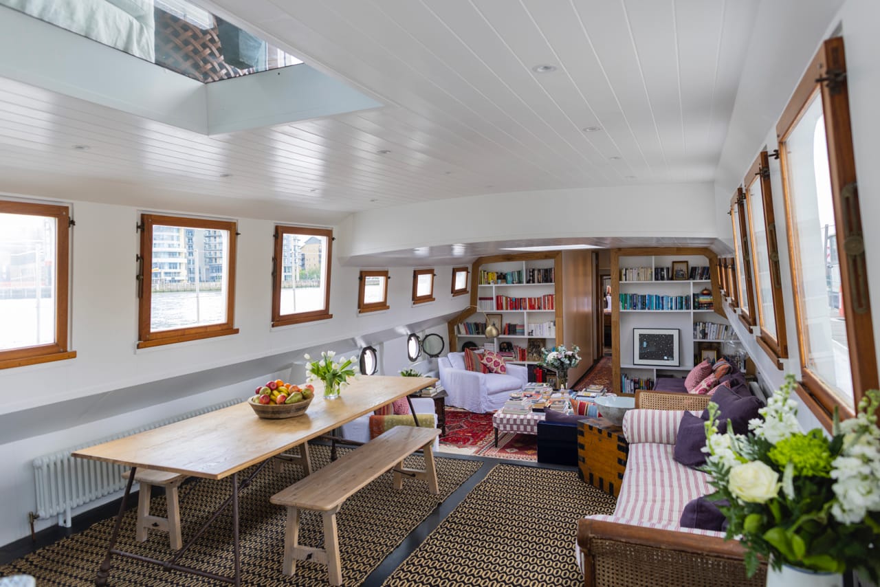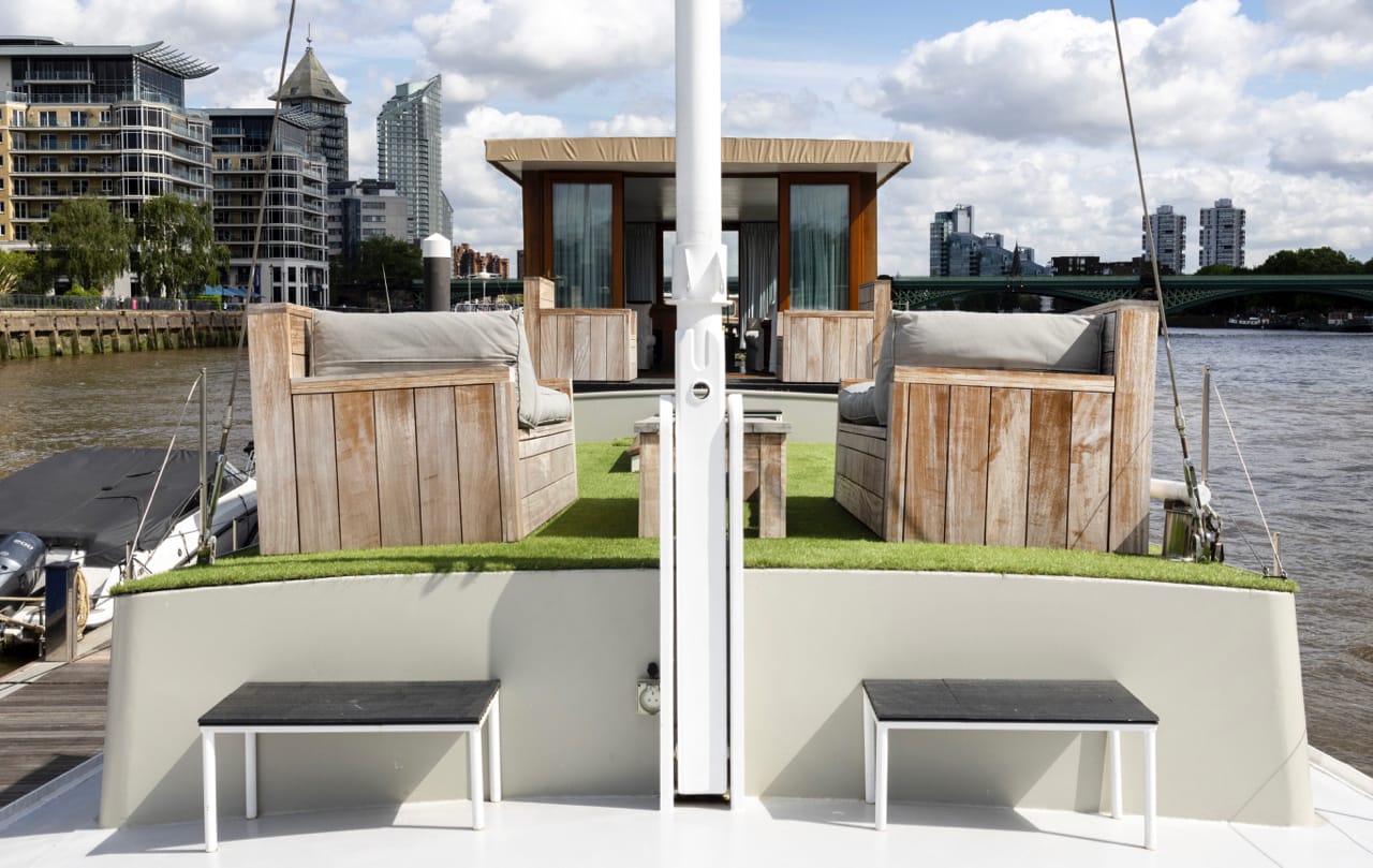 A truly spectacular 30 metre Luxe-Motor Dutch Barge moored on the north bank of the River Thames, Imperial Wharf. It has 360 degree views of the river with large windows on the main floor offering exceptional light and views of London.