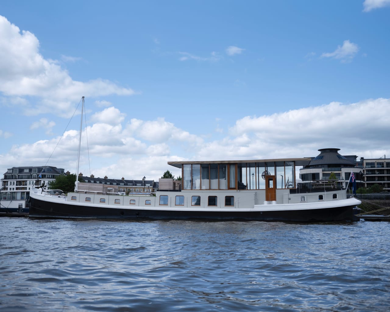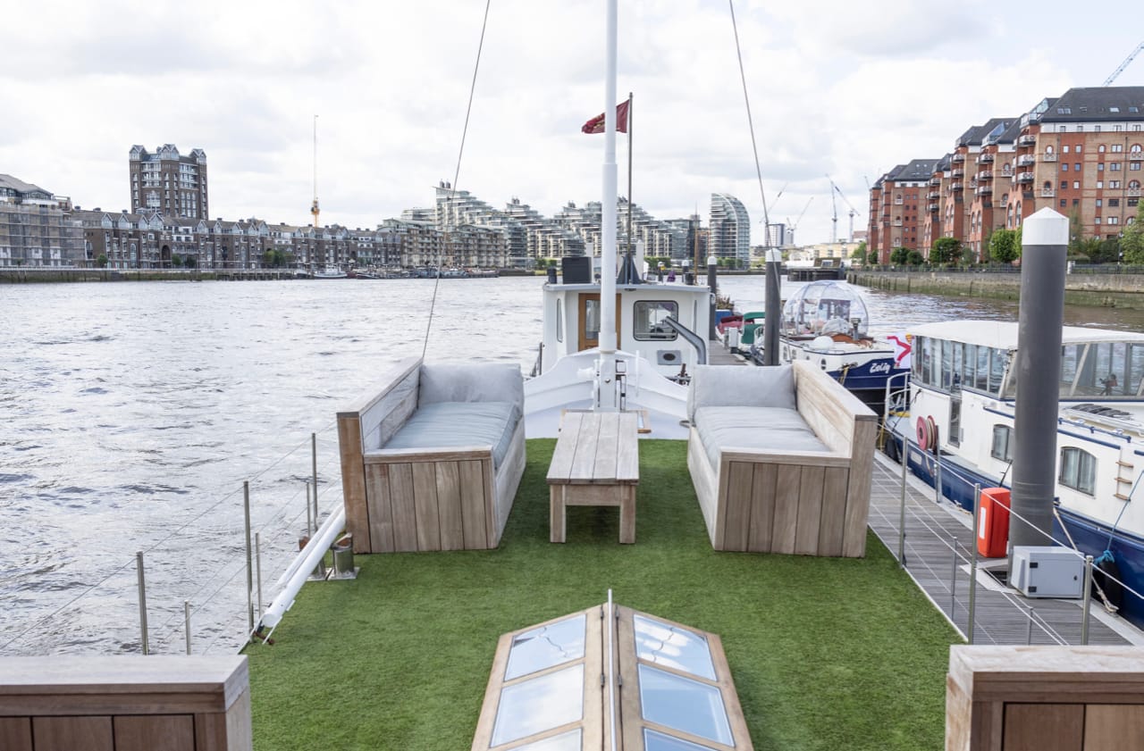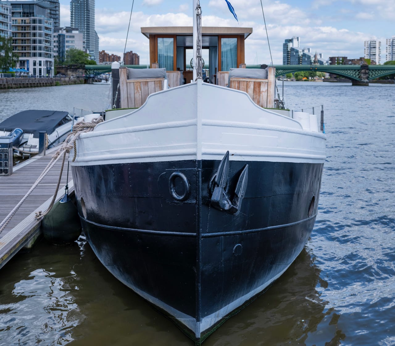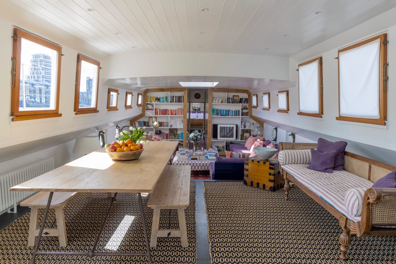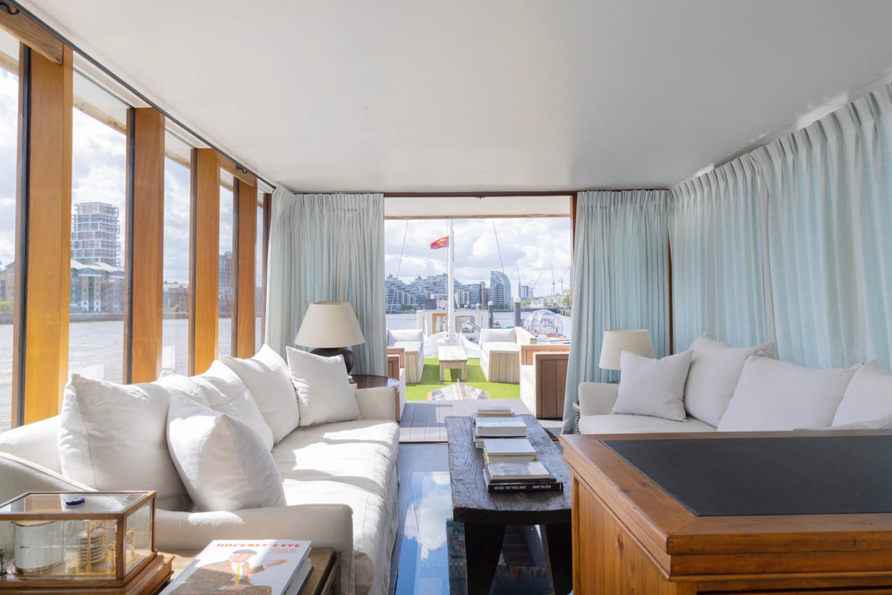 A truly spectacular 30 metre Luxe-Motor Dutch Barge moored on the north bank of the River Thames, Imperial Wharf. It has 360 degree views of the river with large windows on the main floor offering exceptional light and views of London.