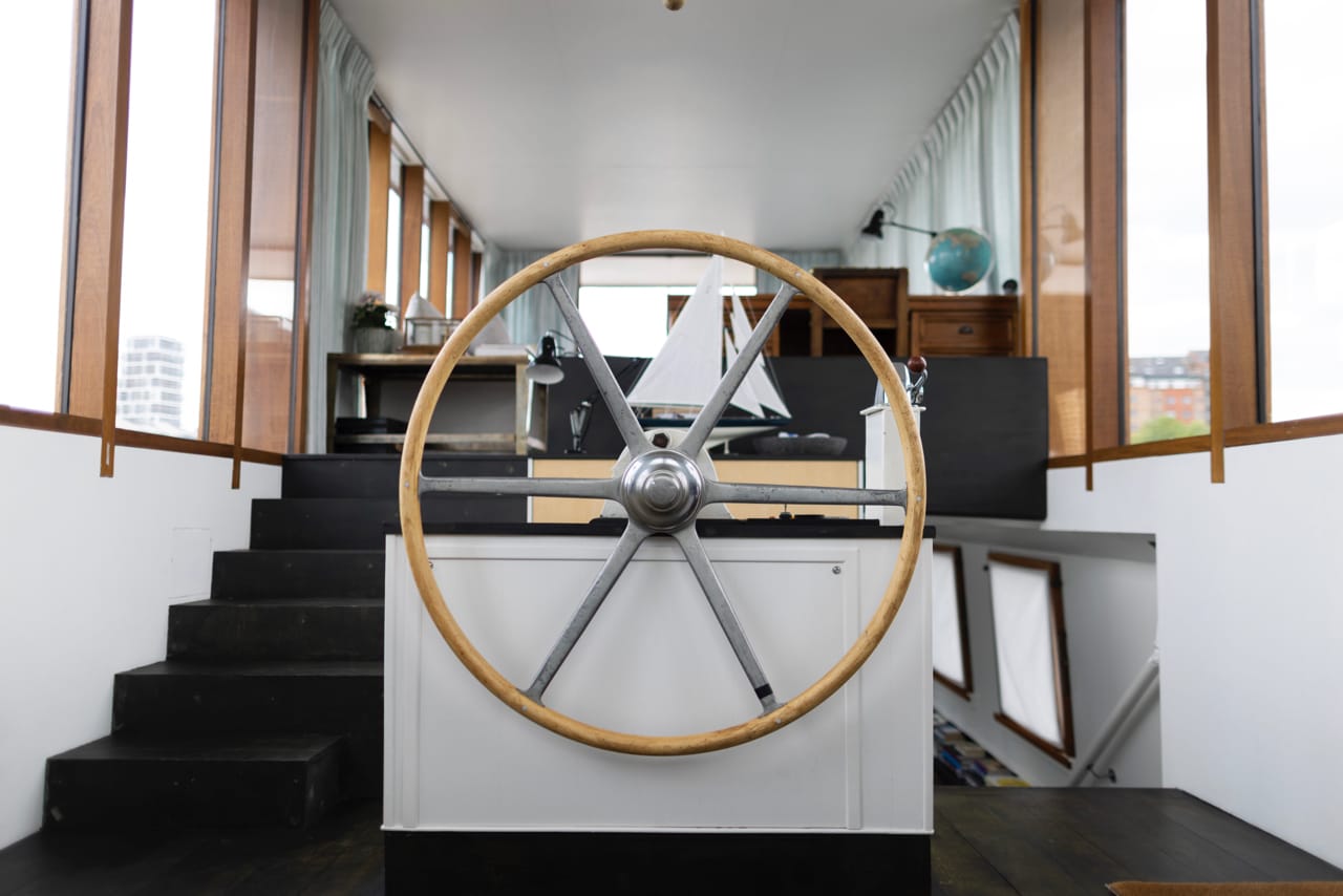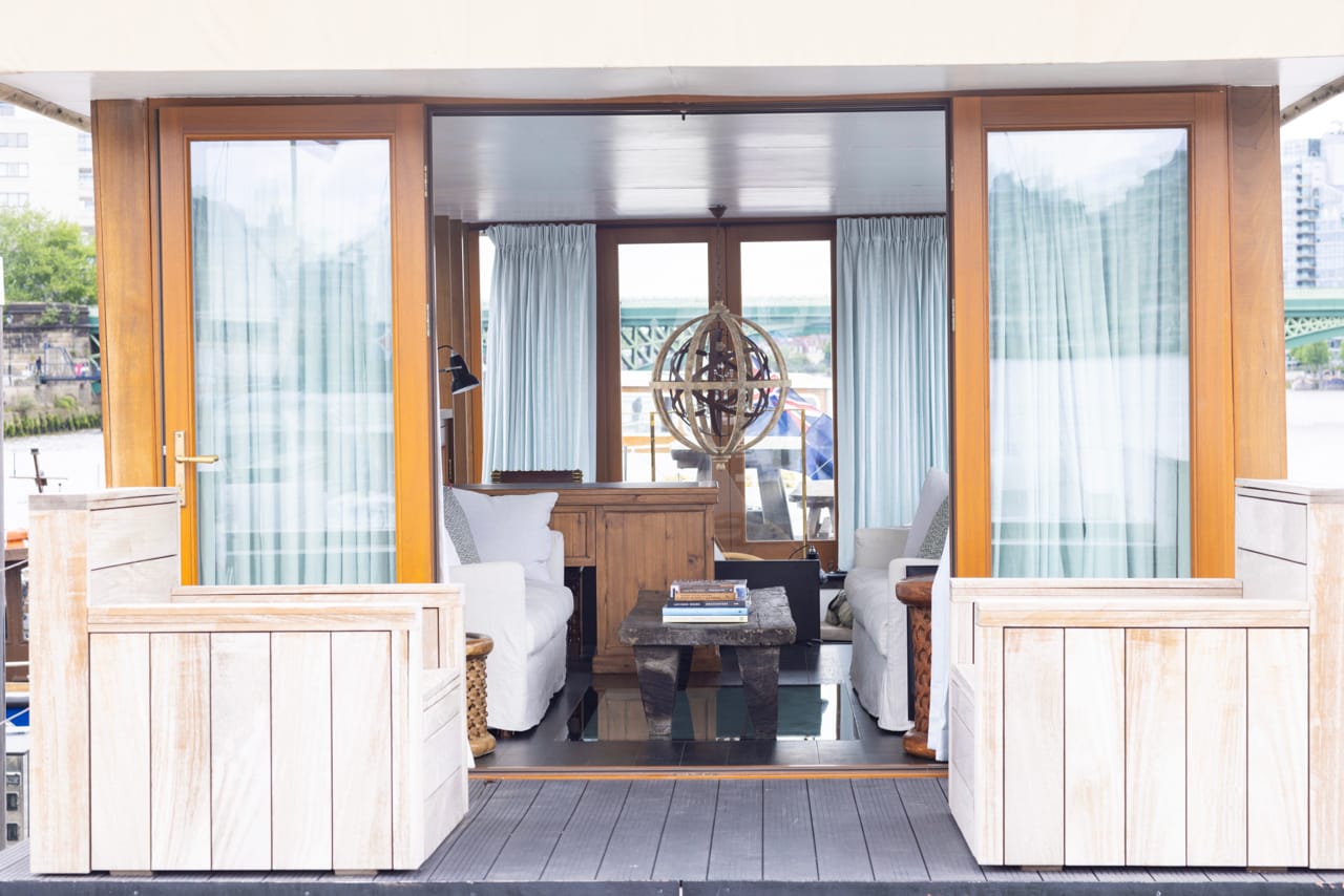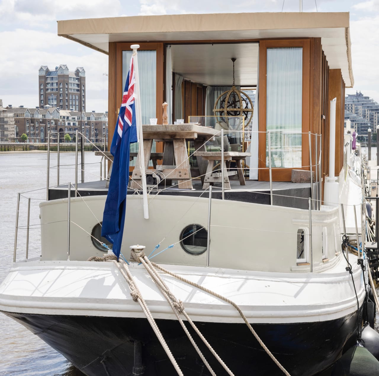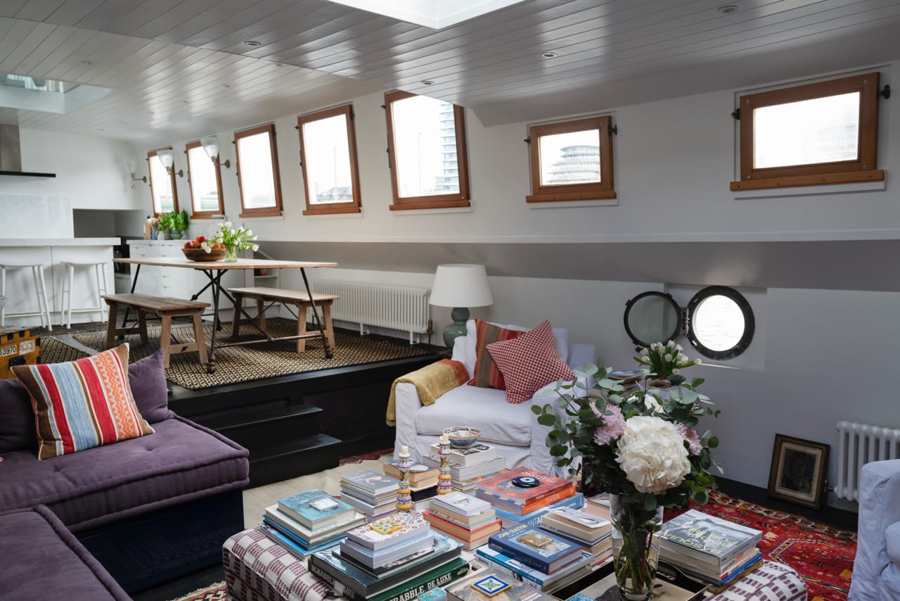 A truly spectacular 30 metre Luxe-Motor Dutch Barge moored on the north bank of the River Thames, Imperial Wharf. It has 360 degree views of the river with large windows on the main floor offering exceptional light and views of London.