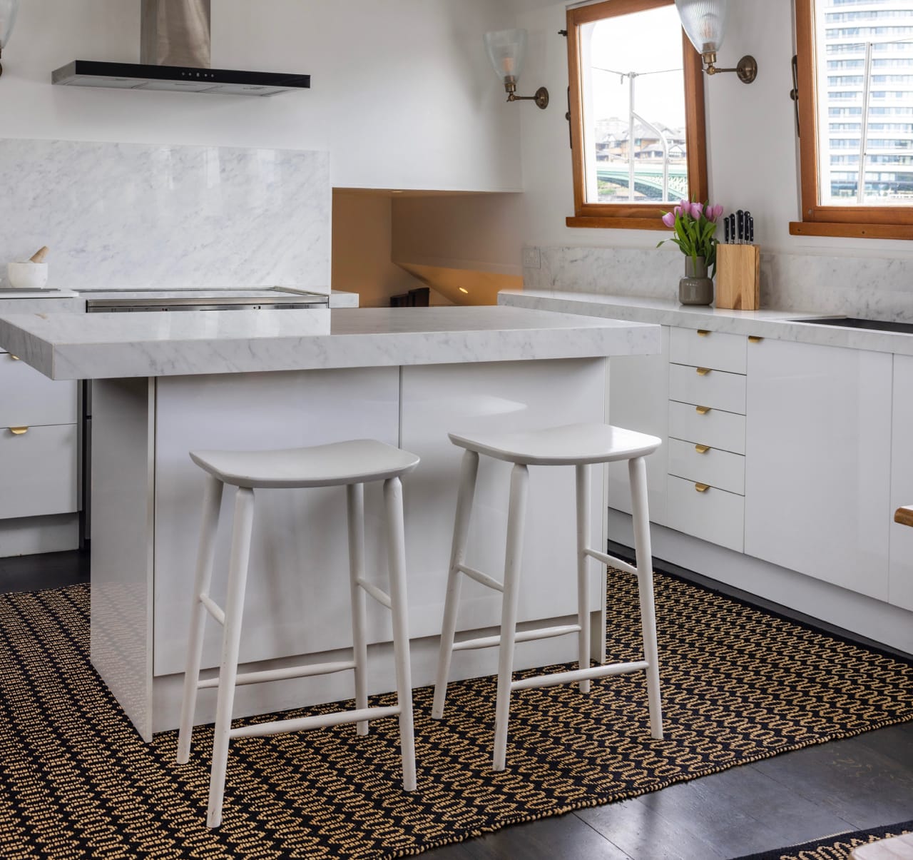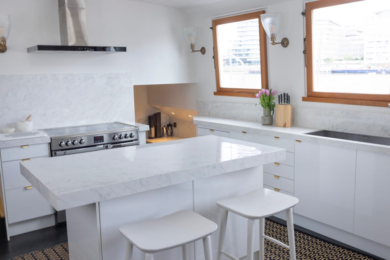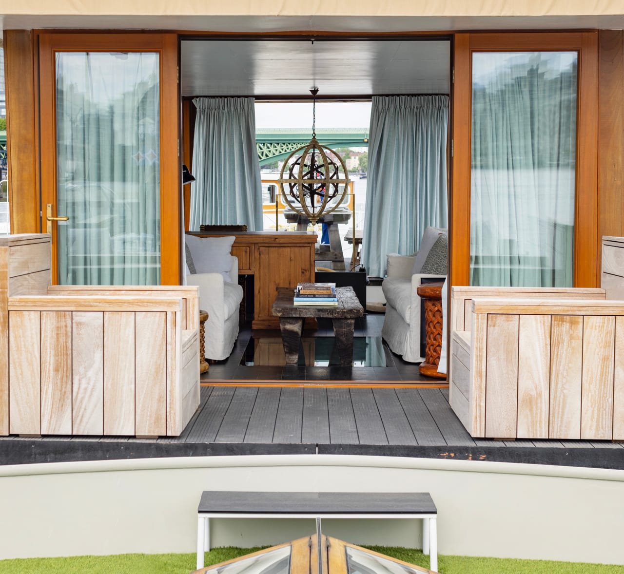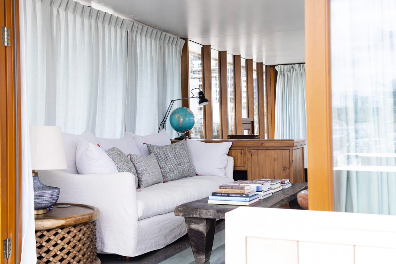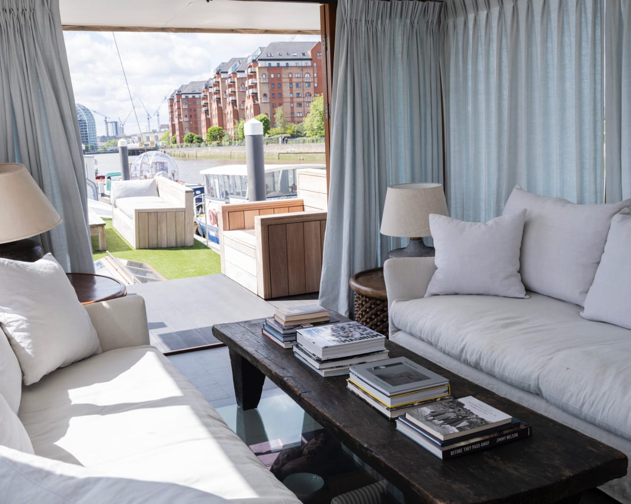 A truly spectacular 30 metre Luxe-Motor Dutch Barge moored on the north bank of the River Thames, Imperial Wharf. It has 360 degree views of the river with large windows on the main floor offering exceptional light and views of London.