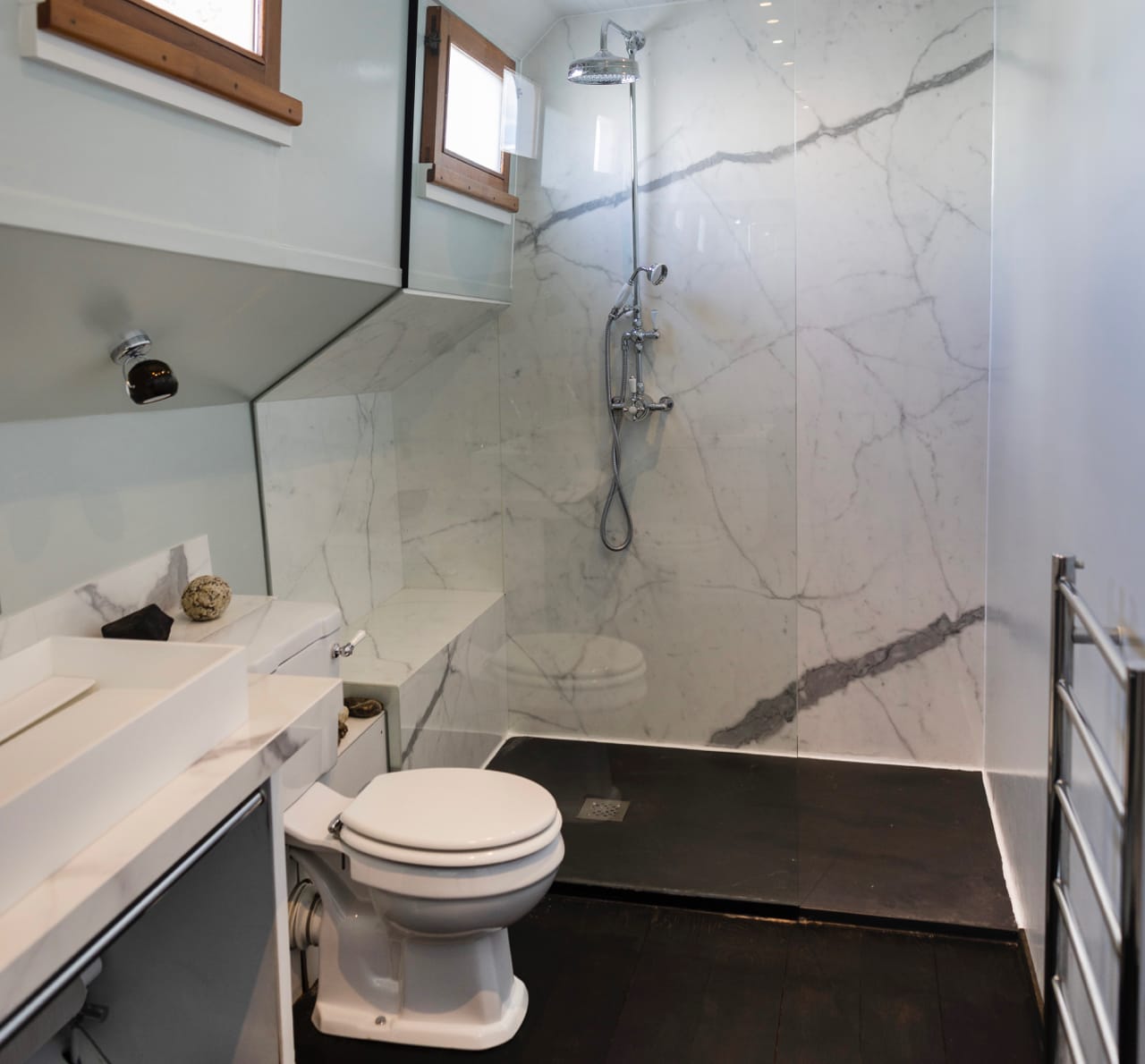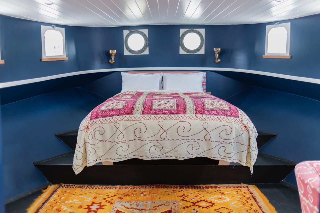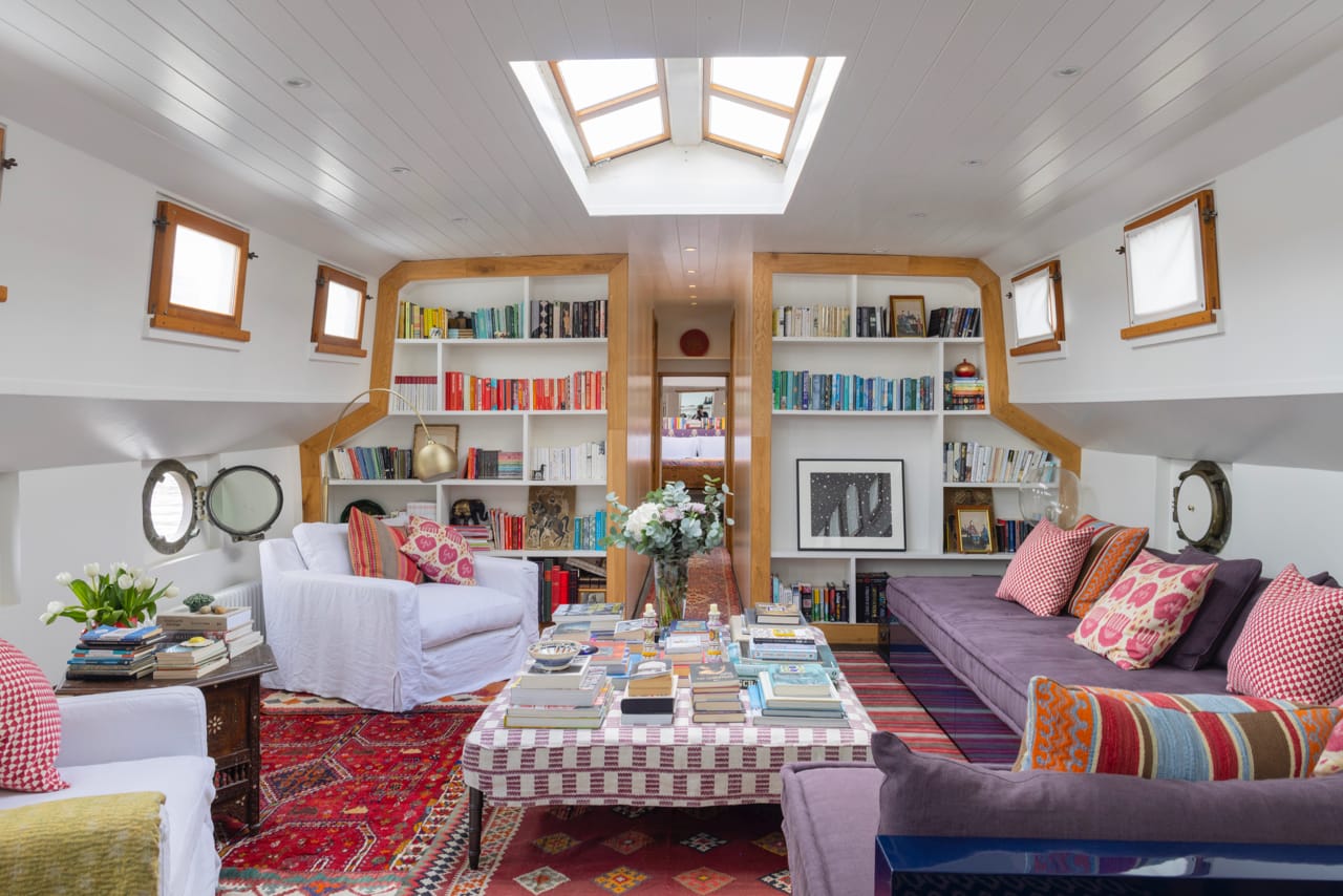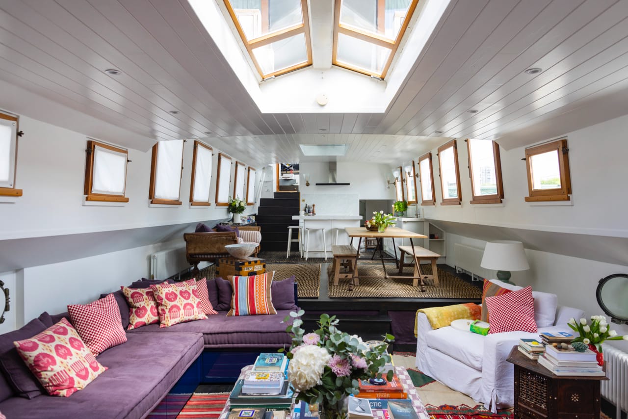 It has teak framed windows, sky lights and a solid oak wood floor which stretches the entire length of the boat. The barge contains 3 cabins, 2 bathrooms and an amazing upper level with open plan, split level living area covering over 50 sq. meters.