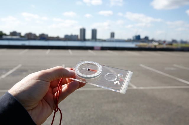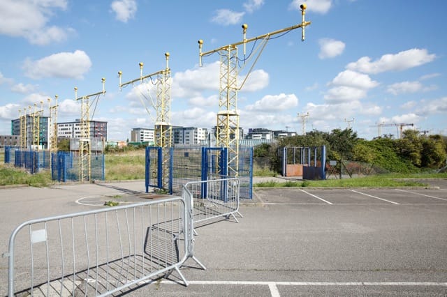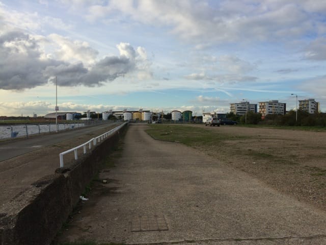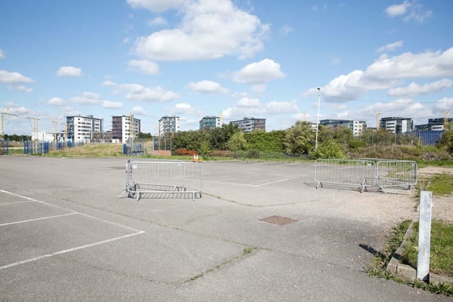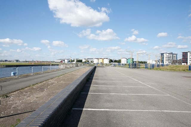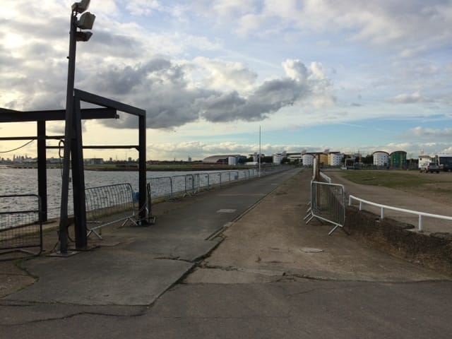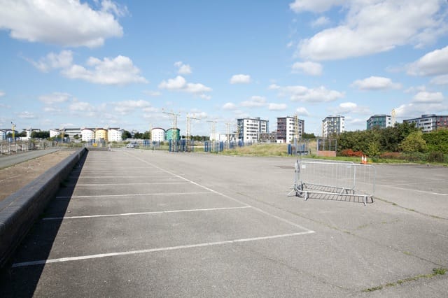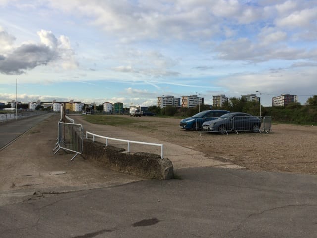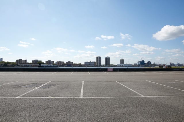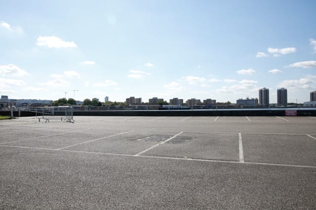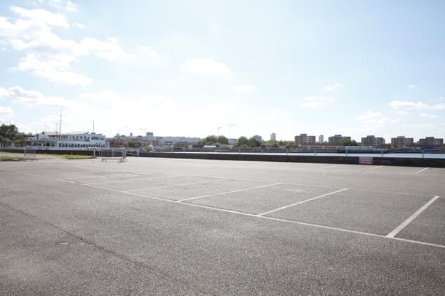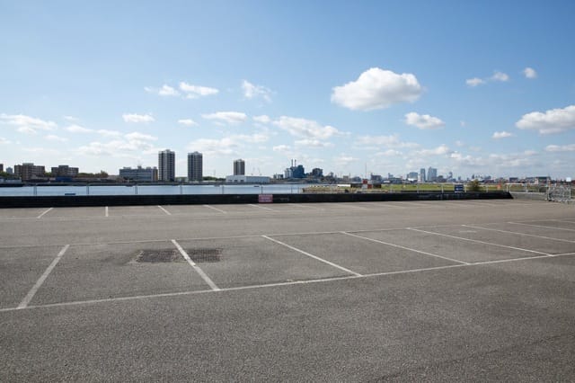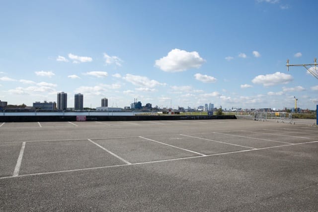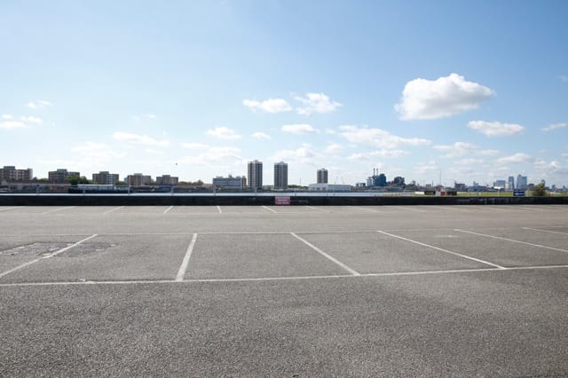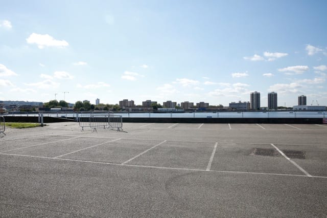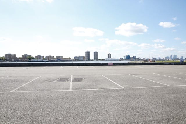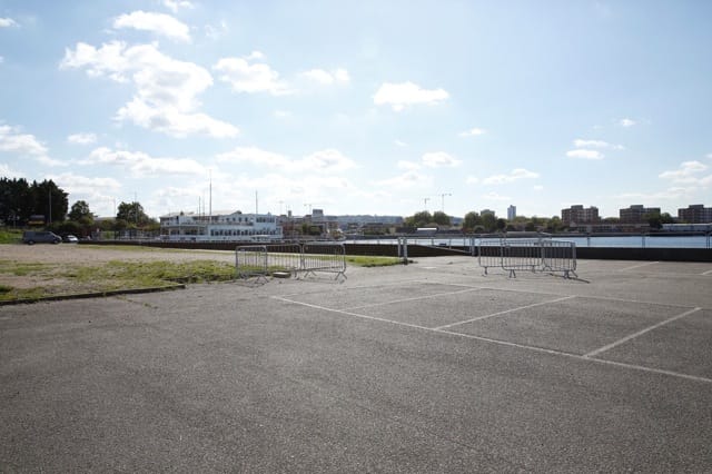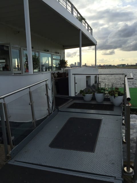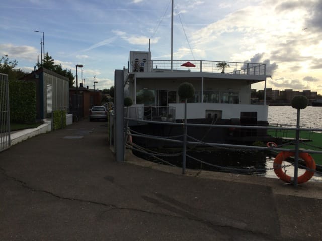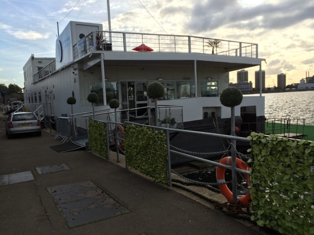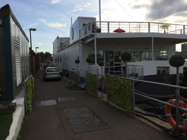 Large car park overlooking the Thames, and a floating venue containing an outdoor seating area and an indoor bar. Based in East London.